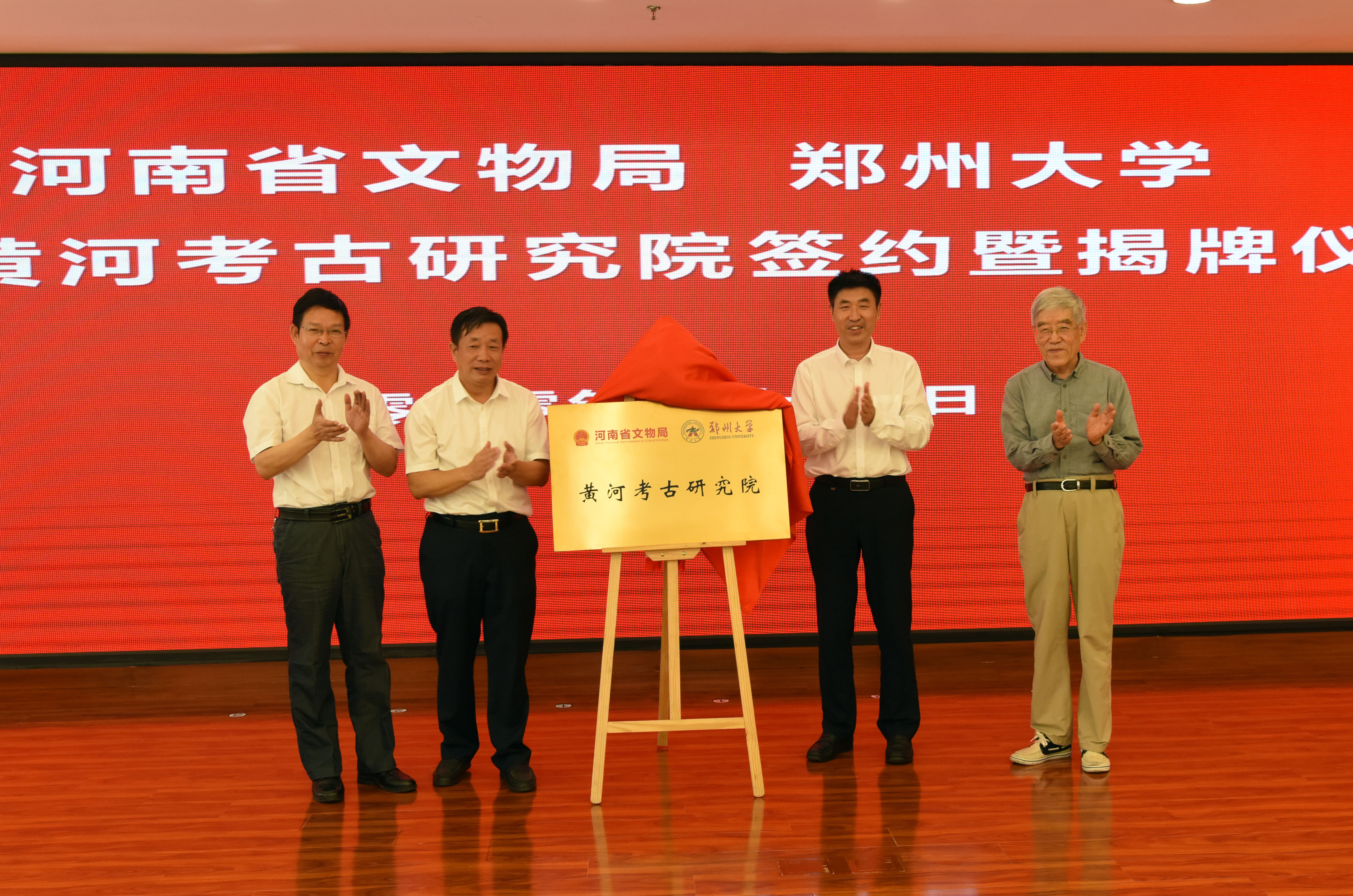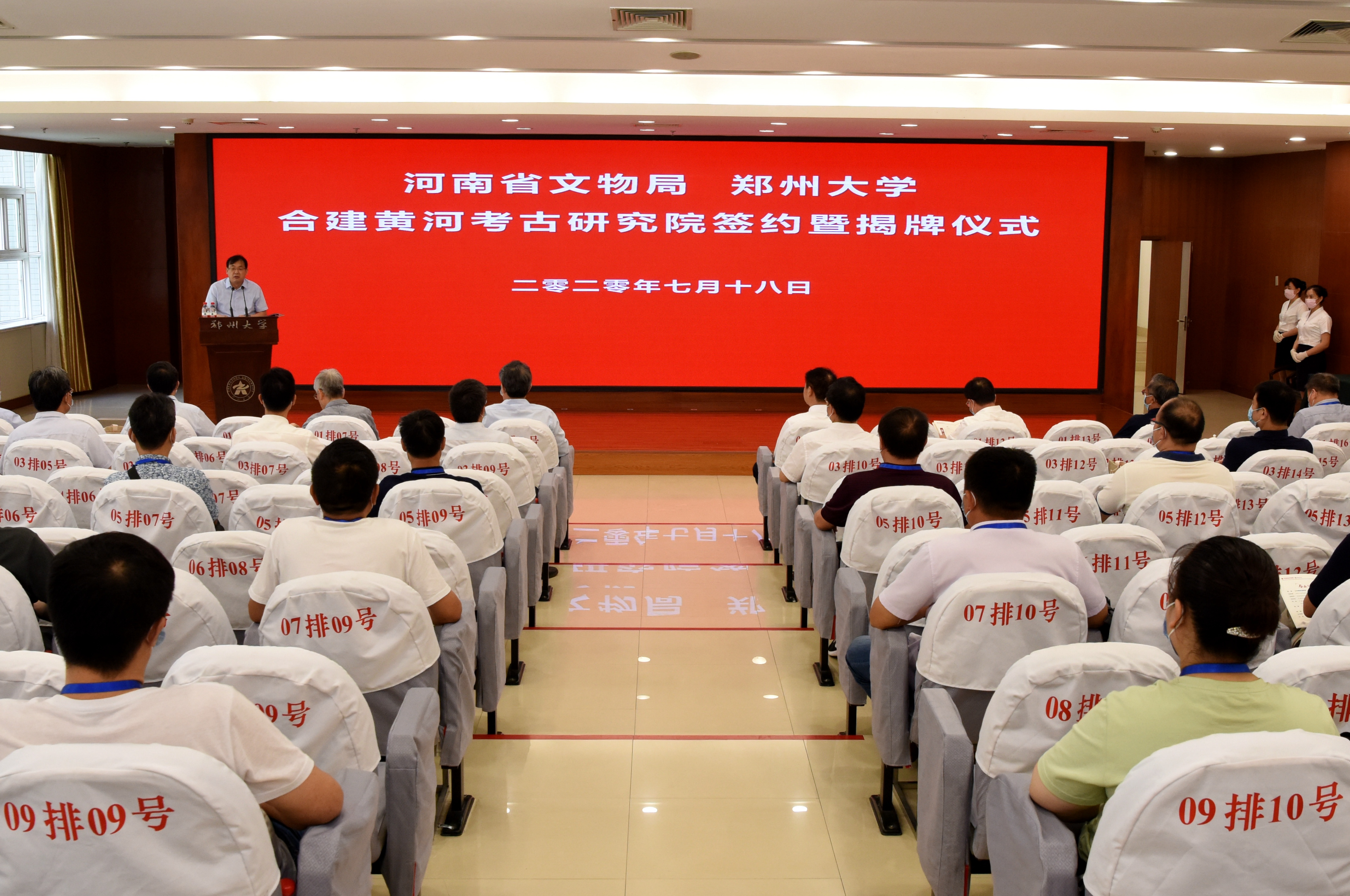 7月18日上午,bat365在线中国官网登录入口与河南省文物局合建黄河考古研究院签约暨揭牌仪式在bat365在线中国官网登录入口主校区举行。bat365在线中国官网登录入口党委书记宋争辉,河南省政协副主席、bat365在线中国官网登录入口校长刘炯天,中国社会科学院学部委员、bat365在线中国官网登录入口学科特聘教授刘庆柱,中国社会科学院学部委员、《考古学报》副主编、bat365在线中国官网登录入口学科特聘教授冯时,中国科学院研究员、bat365在线中国官网登录入口学科特聘教授、“中华文明根系研究”项目首席科学家高星,教育部长江学者特聘教授、四川大学历史文化学院院长霍巍,教育部长江学者特聘教授、吉林大学考古学院院长赵宾福,河南省文物局局长田凯,副局长贾连敏,中国考古学会常务理事、河南省文物考古学会会长孙英民,河南省文物考古研究院院长刘海旺出席。河南省文物局、河南省文物考古研究院、河南省各地市文物考古管理单位主要负责同志及学校相关职能部门负责同志参加仪式。仪式由校党委常委、副校长韩国河主持。