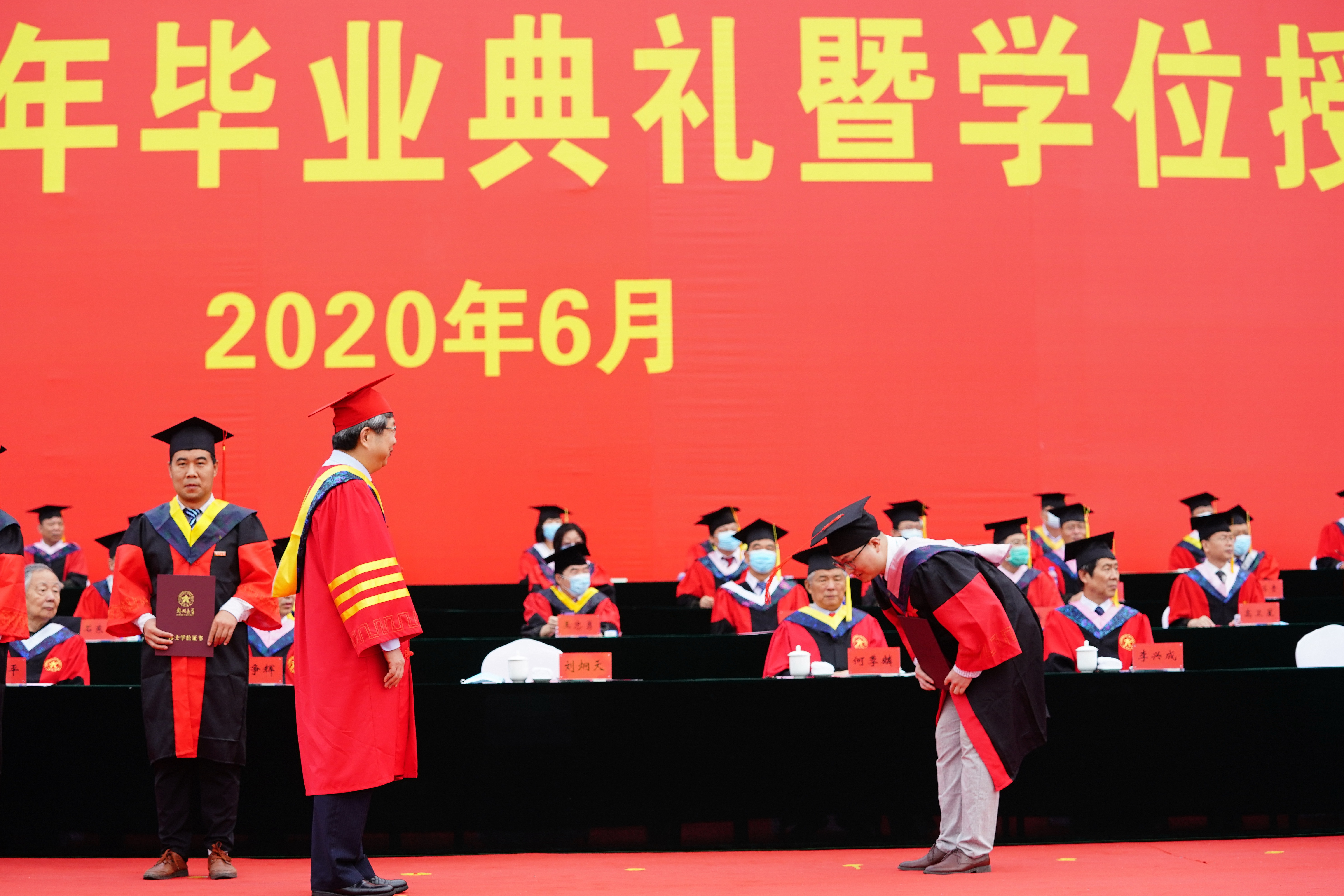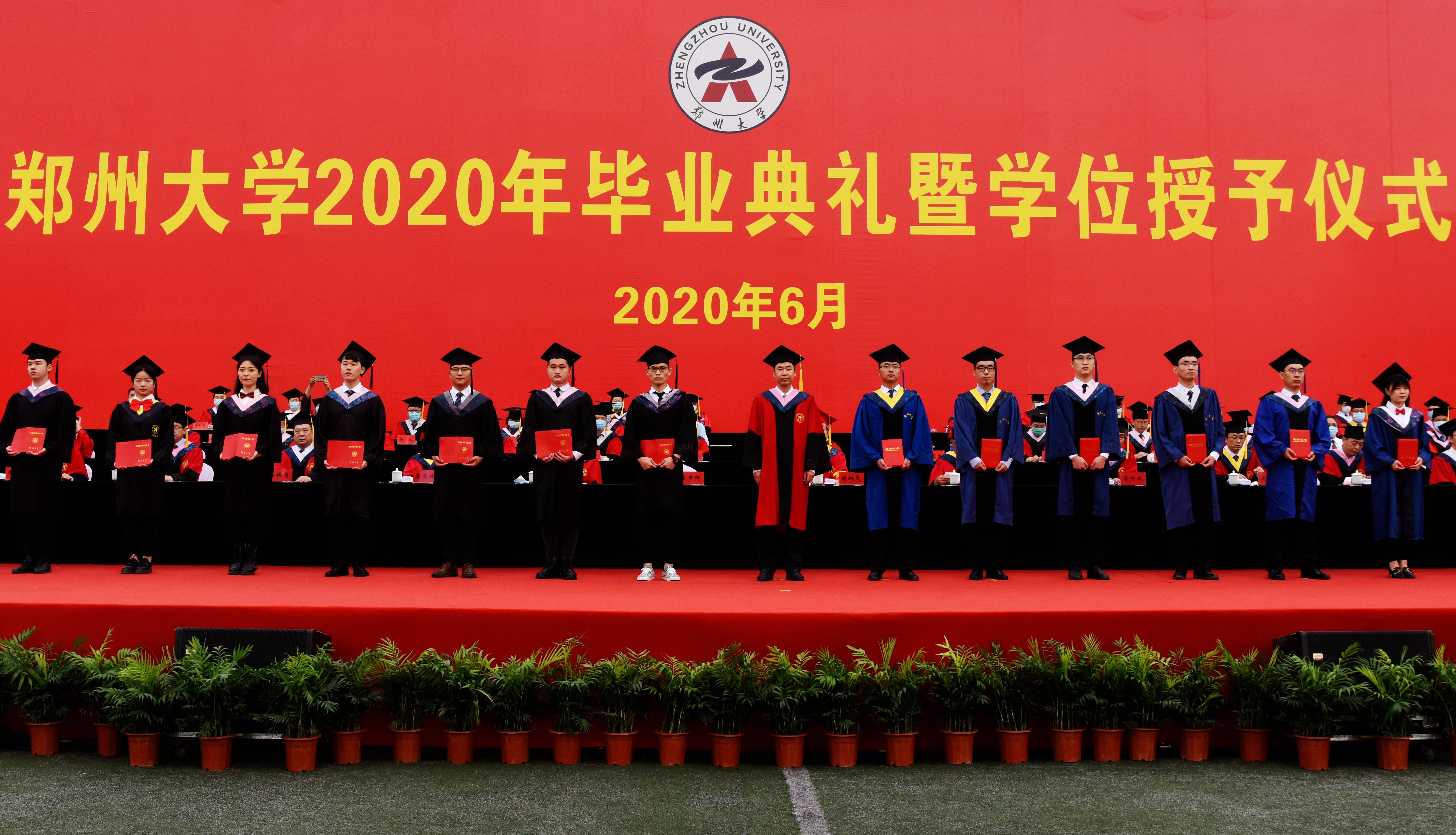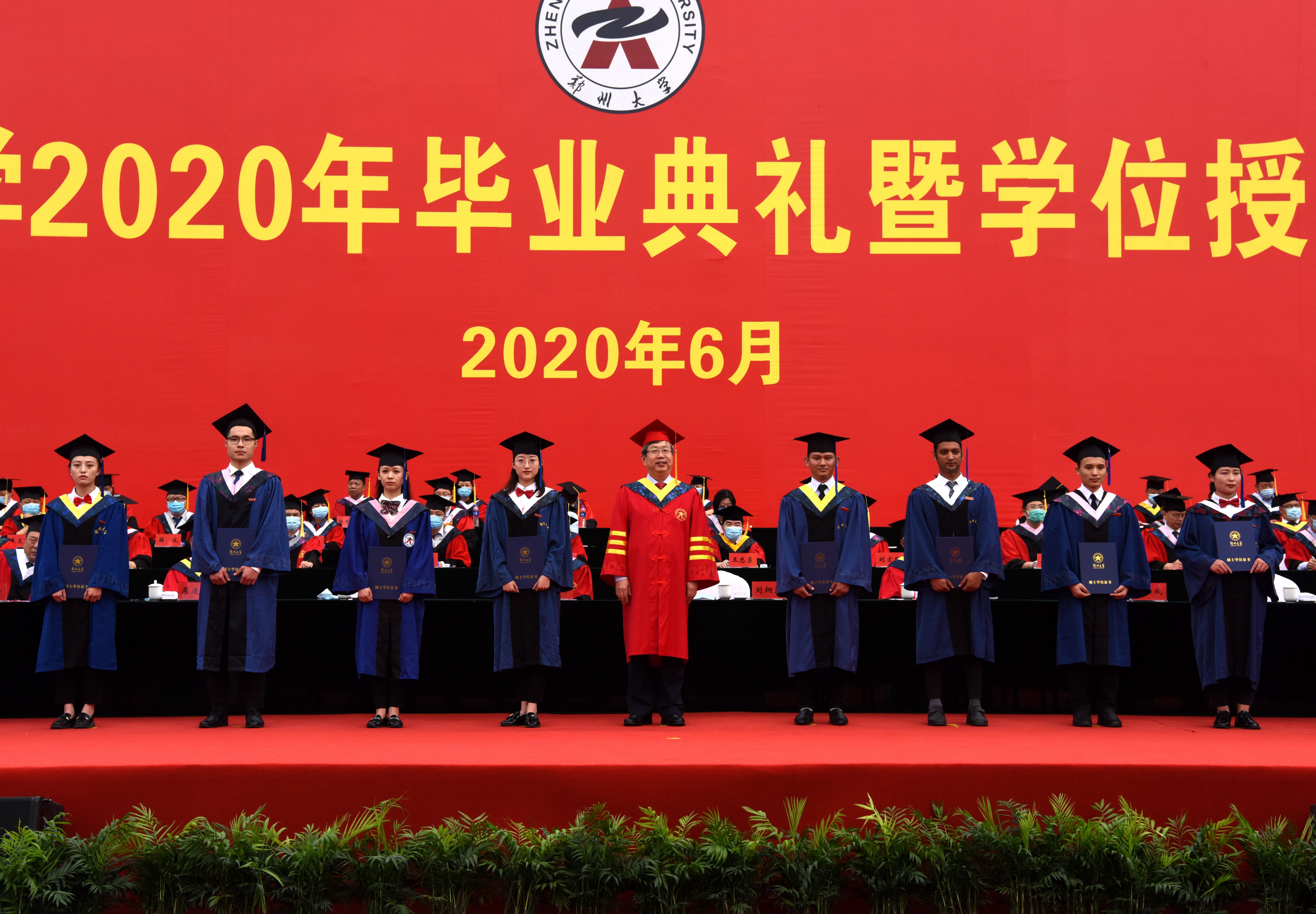 厚山脚下,踌躇满志,长做青春逐梦人;强国路上,韬励奋进,永当时代搏击者。6月28日上午,bat365在线中国官网登录入口隆重举行2020年毕业典礼暨学位授予仪式,典礼采用线下与线上同步进行的“云毕业典礼”形式,2000名毕业生代表参加现场典礼,14000余名毕业生共聚云端线上观礼。校领导宋争辉、刘炯天、屈凌波、李兴成、谷振清、张倩红、关绍康、韩国河、吴宏阳、赵明皞、董子钢,中国科学院院士、物理学院首席教授霍裕平,中国工程院院士、材料科学与工程学院、河南省资源与材料工业技术研究院院长何季麟,bat365在线中国官网登录入口第一附属医院院长刘章锁,校学位委员会委员、各院(系)主要负责同志等出席典礼并在主席台就坐,校内各单位主要负责同志、教师代表和2020届全体毕业生1.6余万人参加了毕业典礼。典礼仪式由副校长张倩红主持。