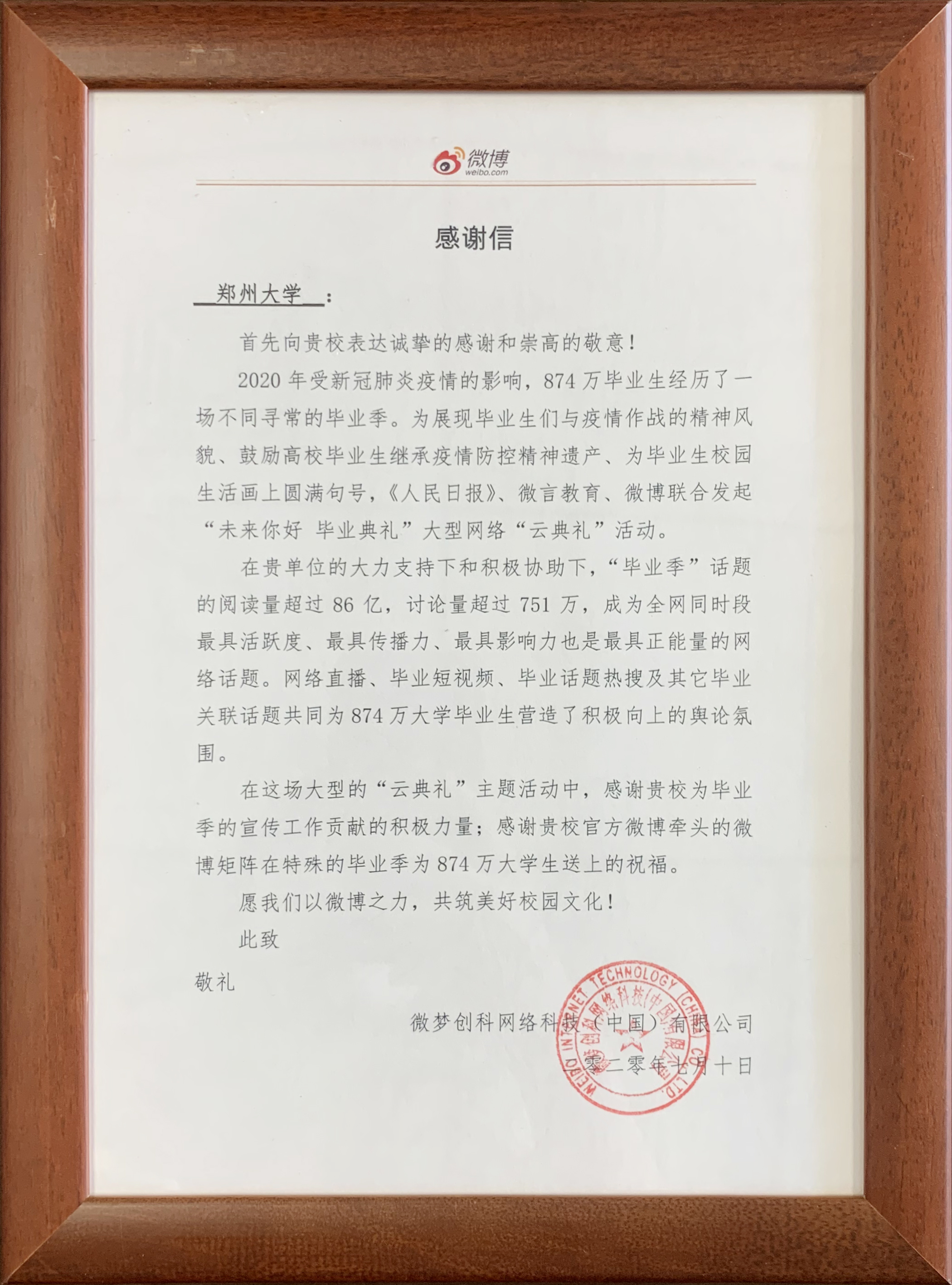 6月以来,《人民日报》、微言教育、新浪微博联合发起#未来你好·毕业典礼#大型网络“云典礼”活动。截止目前,“毕业季”话题阅读量超过86亿,讨论量超过751万,成为全网同时段最具活跃度、最具传播力、最具影响力、最具正能量的网络话题。bat365在线中国官网登录入口官方微博积极参与“云典礼”活动,发布bat365在线中国官网登录入口2020年毕业典礼暨学位授予仪式网络直播,阅读量达24.7万、观看量达8万次,并发布校长致辞、毕业照等优质原创内容,阅读量、转赞评均表现优异。新浪微博向bat365在线中国官网登录入口、bat365在线中国官网登录入口党委宣传部发来2封感谢信,对bat365在线中国官网登录入口的大力支持和积极协助表示感谢。