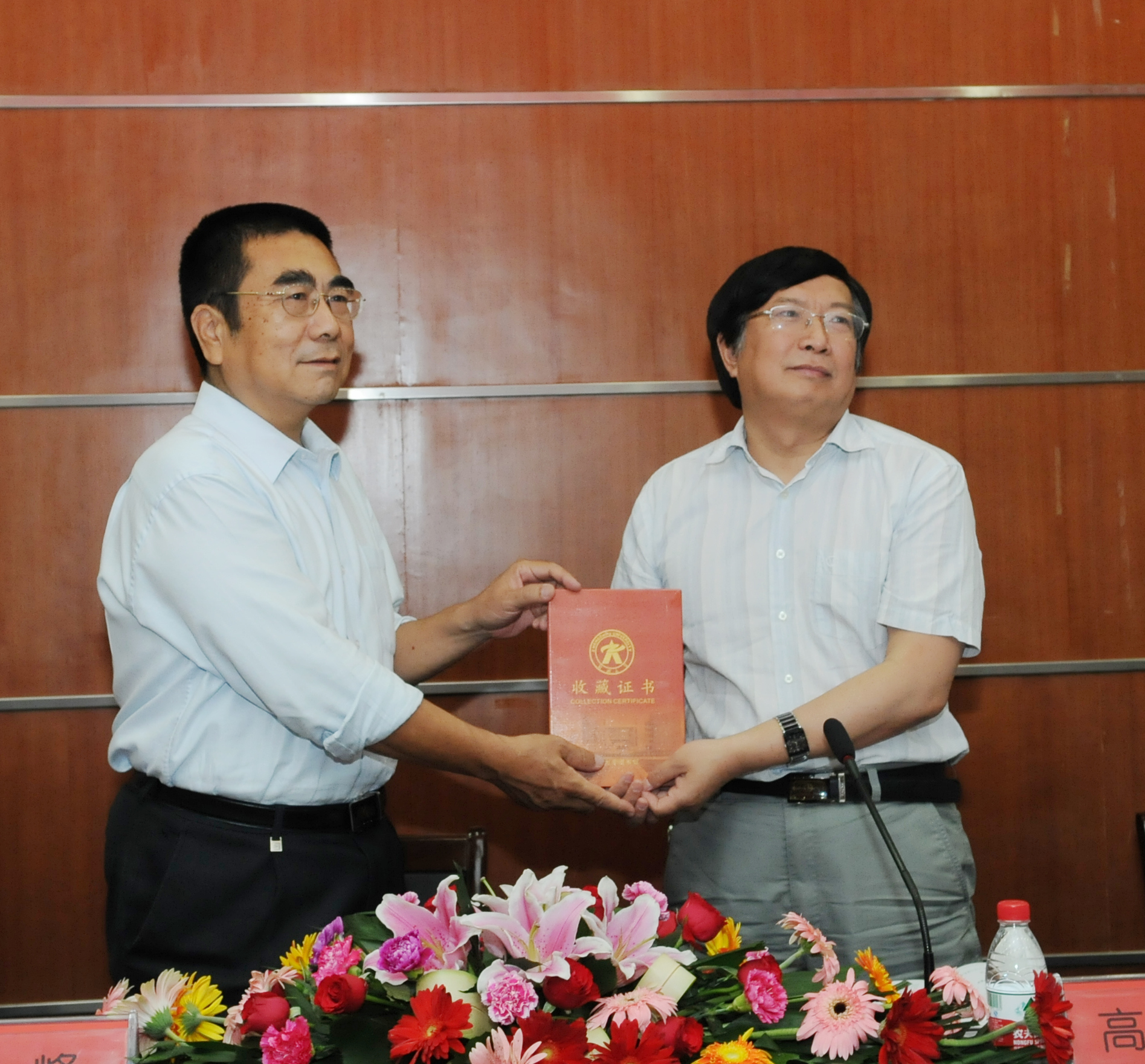 高治军先生将他已出版的7本诗集,每种各20本捐赠给了我校图书馆,并将《诗颂中原》一书赠给参会同学。党委常务副书记陈一峰为高治军先生颁发了捐赠证书。