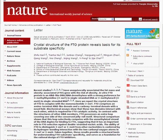通过与北京生命科学研究所柴继杰博士研究室等单位合作,我校化学系常俊标教授及所指导的博士生王强合作完成题目为“Crystal structure of the FTO protein reveals basis for its substrate specificity”的文章2010年4月7日在国际重要期刊《Nature》杂志上发表。对肥胖相关基因FTO在体内的功能及其对底物选择性研究取得了重要突破。论文的发表标志着我校在该研究领域达到了国际领先水平。