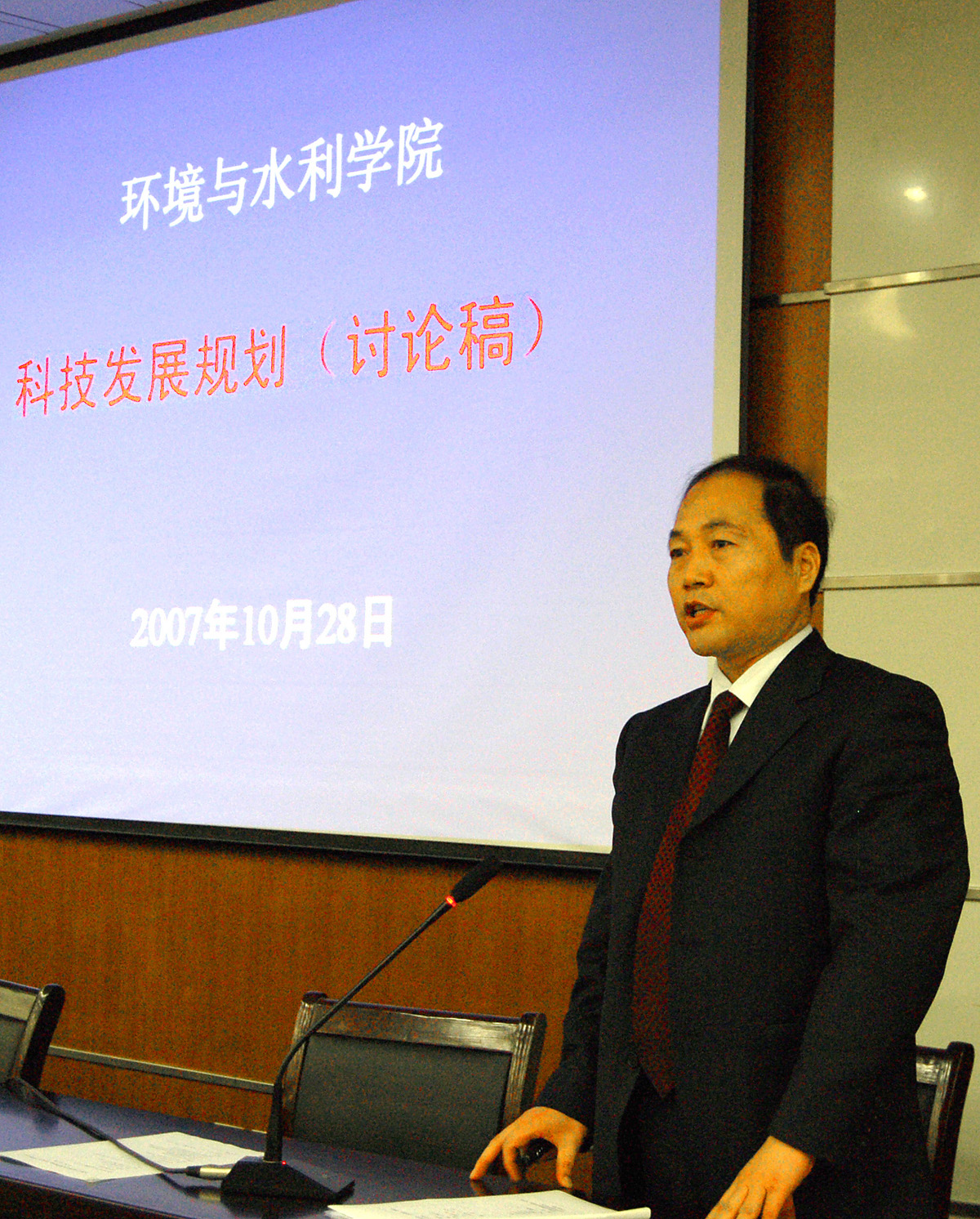 10月28日,环境与水利学院第一届科技工作研讨会在图书馆第二学术报告厅召开。校长申长雨,省科技厅人才处处长李朝霞、省教育厅科技外事处副处长孔繁士、省水利厅科教处副处长李发祥、省环保局科技处长李敏、黄河水利委员会科技外事局科技处副处长任松长、华北水利水电学院科研处处长解伟等出席会议。我校环水学院全体教师和部分学生代表以及学校科研处等部门负责人参加了会议。
