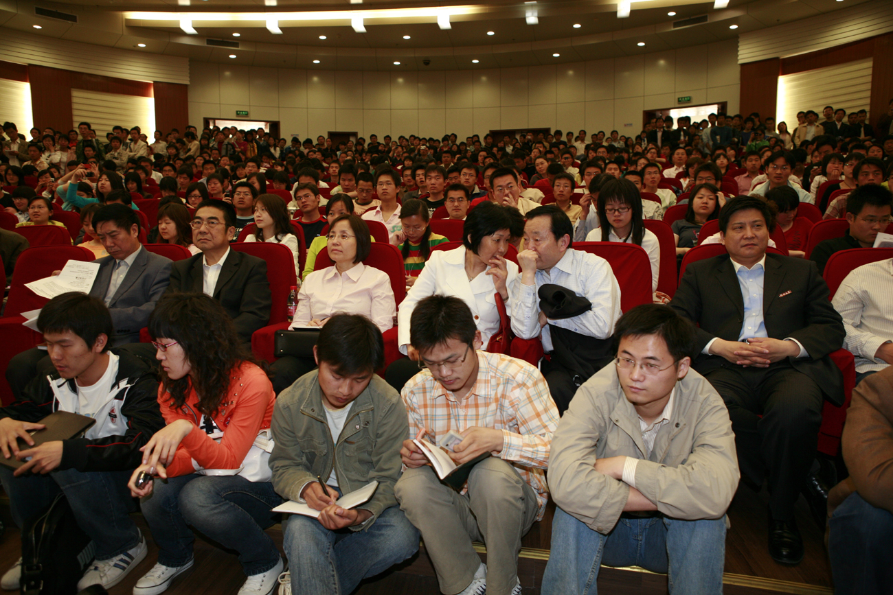 整场报告会持续了两个小时,师生们不时被老先生的幽默诙谐逗乐,欢声笑语掌声不绝于耳。不少同学感叹:“大师果然学识渊博,不仅经济讲的好,历史文化也很精通。”商学院2006级金融学专业的王晓川同学说:“大师的见解很独到,尤其是他对高额外汇储备的分析很新颖,使我对经济热点问题有了更深的理解,今后我会注重把书本学习和社会实际联系起来,以后争取自主创业,在社会的平台上为他人做贡献。”报告会一开场,当厉以宁教授看到台下挤满了站着听讲的学生时,他大手一挥亲切地说:“你们可以坐到主席台上来啊,这边空间这么大。”有一些同学马上放松了心情围坐在主席台前,这么近与大师“亲密接触”,也成了报告会上的一段佳话。