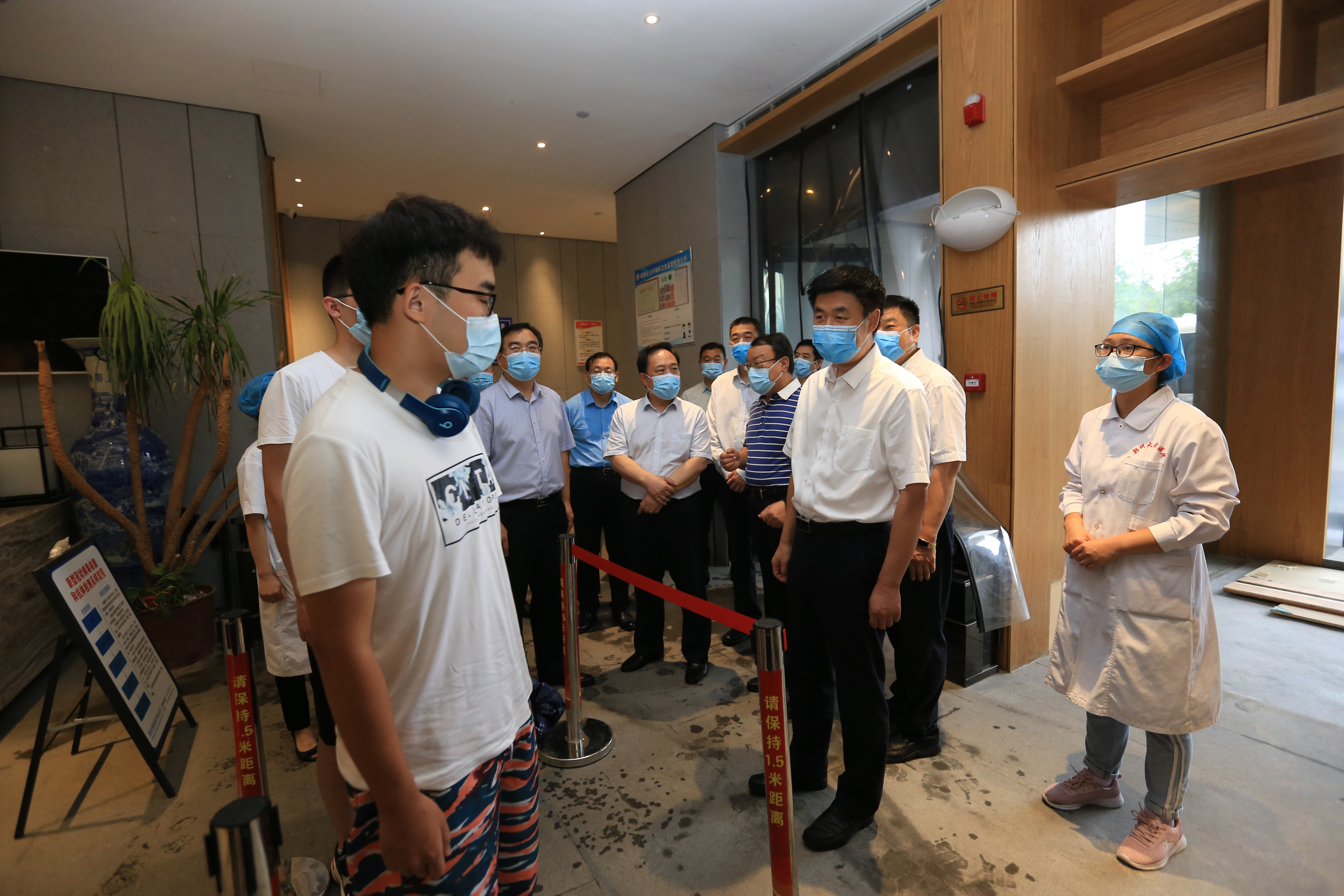 校领导在核酸检测点和隔离点询问高风险地区返校学生身体状况