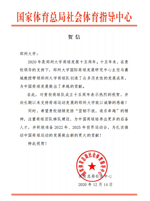 今年是bat365在线中国官网登录入口荷球发展十五周年。为庆祝这一盛事,国家体育总局社会体育指导中心于近日向bat365在线中国官网登录入口发来贺信。