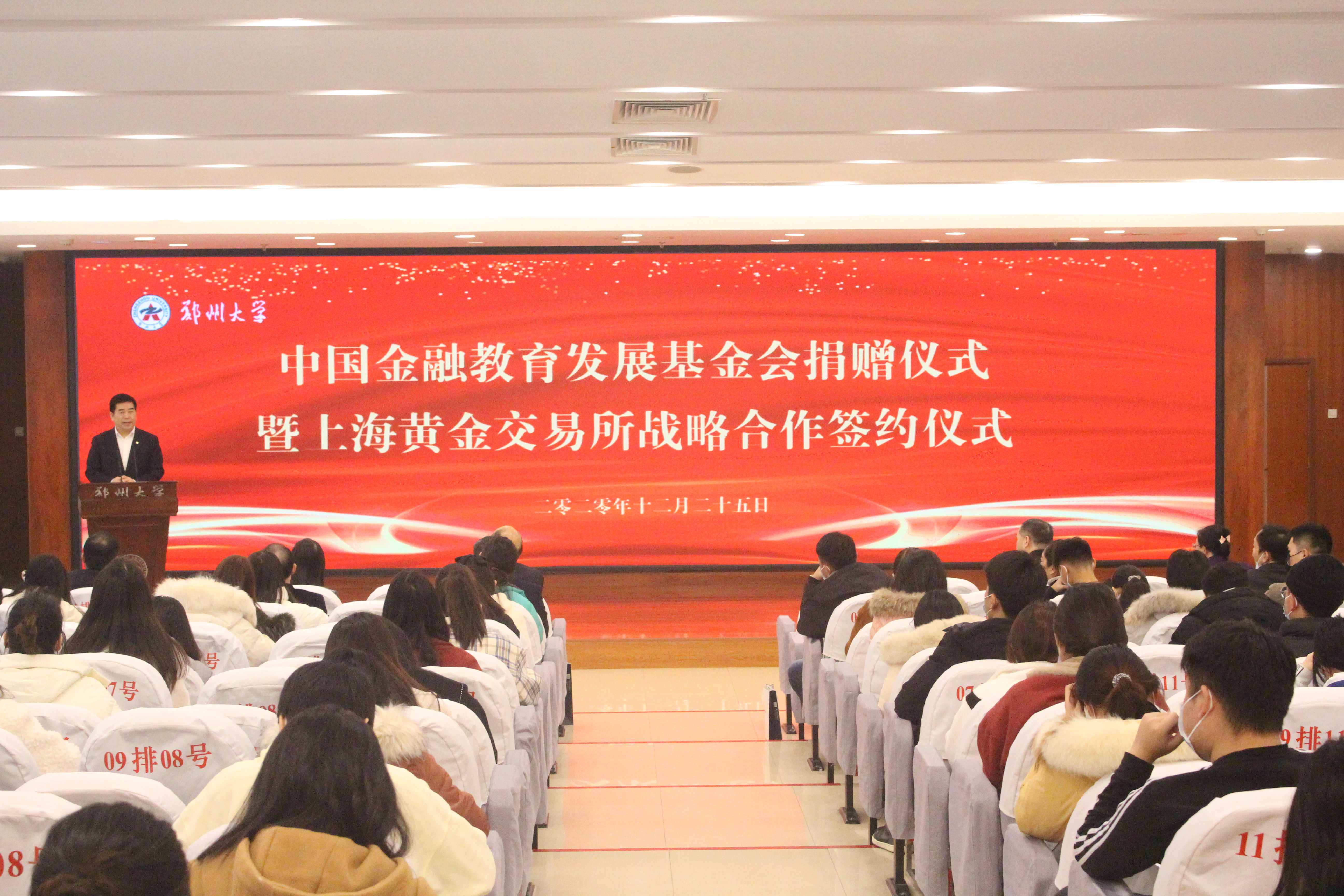 12月25日,bat365在线中国官网登录入口举行中国金融教育发展基金会捐赠仪式暨上海黄金交易所战略合作签约仪式。上海黄金交易所党委书记兼理事长、1983级校友焦瑾璞,中国金融教育发展基金会副秘书长王微微,校党委常委、纪委书记、监察专员许东升出席。对外联络办公室、商学院等单位负责同志及师生代表130余人参加。