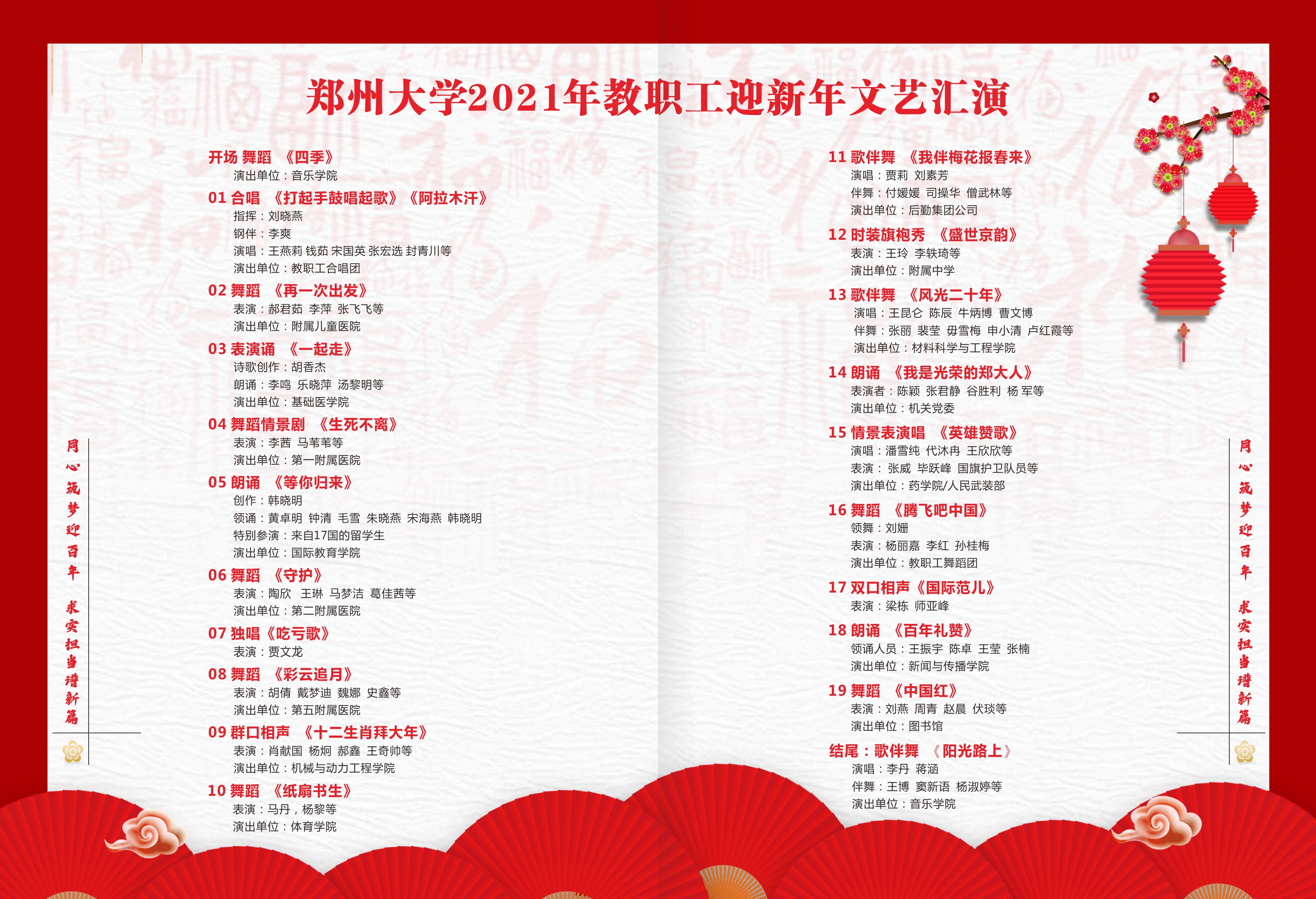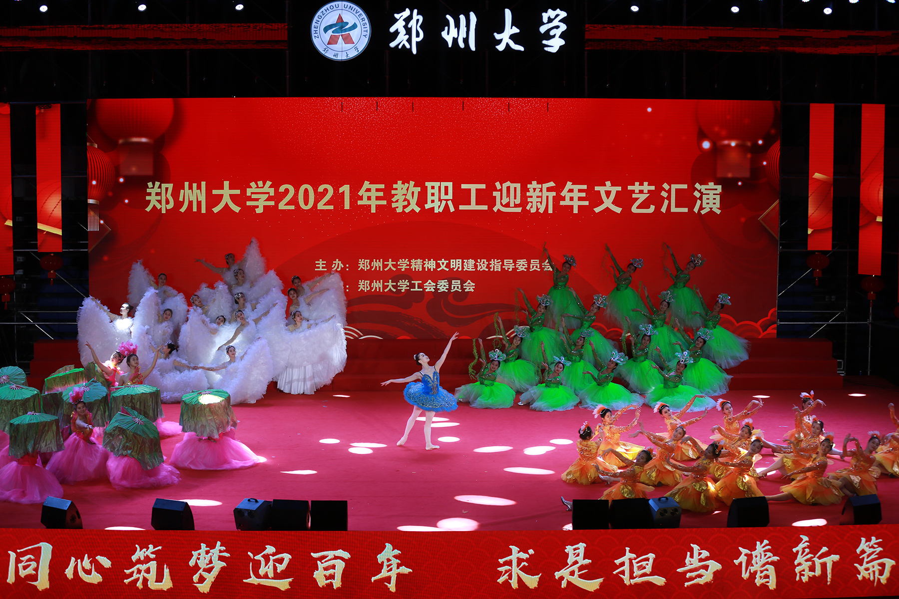 2020年12月31日,由学校精神文明建设指导委员会主办、工会委员会承办的2021年bat365在线中国官网登录入口教职工庆元旦迎新年文艺汇演在主校区中心体育馆举行。音乐学院舞蹈《四季》拉开晚会序幕,美轮美奂的舞姿演绎出郑大的春夏秋冬;第一附属医院的舞蹈情景剧《生死不离》,生动再现了战疫期间“最美逆行者”为全国人民托起生命方舟的感人故事,现场观众无不感动落泪;国际教育学院带来朗诵《等你归来》,来自世界各地的留学生与郑大师生共克时艰,谱写出一曲人类命运共同体的生动赞歌;第二附属医院的舞蹈《守护》震撼人心,展现了中华民族亿万儿女守望相助、同心战疫的磅礴力量;河南豫剧院副院长贾文龙演唱的著名豫剧片段《吃亏歌》真挚朴实,唱出了广大党员干部人民至上的初心本色;第五附属医院的古典团扇舞《彩云追月》,为嫦娥五号揽月归来喝彩,点燃了为中国航空作出贡献、服务黄河国家战略的郑大人矢志报国、逐梦太空的科研理想;附属中学教师带来一场《盛世京韵》旗袍秀,将国风国韵之美展现得淋漓尽致,以美立德、以美育人;材料科学与工程学院歌伴舞《风光二十年》,讴歌了学校合校20年来的巨大变迁,展现了郑大人拼搏奋进的精神风貌;机关党委职工代表朗诵了由校党委常委、纪委书记许东升创作的诗歌《我是光荣的郑大人》,一流建设的出彩答卷、“求是 担当”的铮铮誓言,自豪与荣光在每一个郑大人心中升腾;药学院和人民武装部激情演绎情景表演《英雄赞歌》,三位抗美援朝老兵登上舞台,激励全校师生学习伟大抗美援朝精神,锤炼意志、勇毅前行;新闻与传播学院集体朗诵《百年礼赞》,带领全校师生重温一个个激荡人心的历史时刻,回望中国共产党波澜壮阔的百年征程,深情献礼建党100周年;图书馆带来舞蹈《中国红》,将火红的灯笼挂满舞台,这一抹红深沉而热烈,表达了郑大人对伟大祖国的深挚祝福;最后,伴随着欢快的歌伴舞《阳光路上》,文艺汇演圆满落幕。线上线下观众收获了满满的喜悦与感动,沉浸在跨年夜的浓厚氛围中。现将现场精彩节目图片奉上,敬请大家欣赏。(魏洪波 陈卓 孙未 刘文立 摄影)