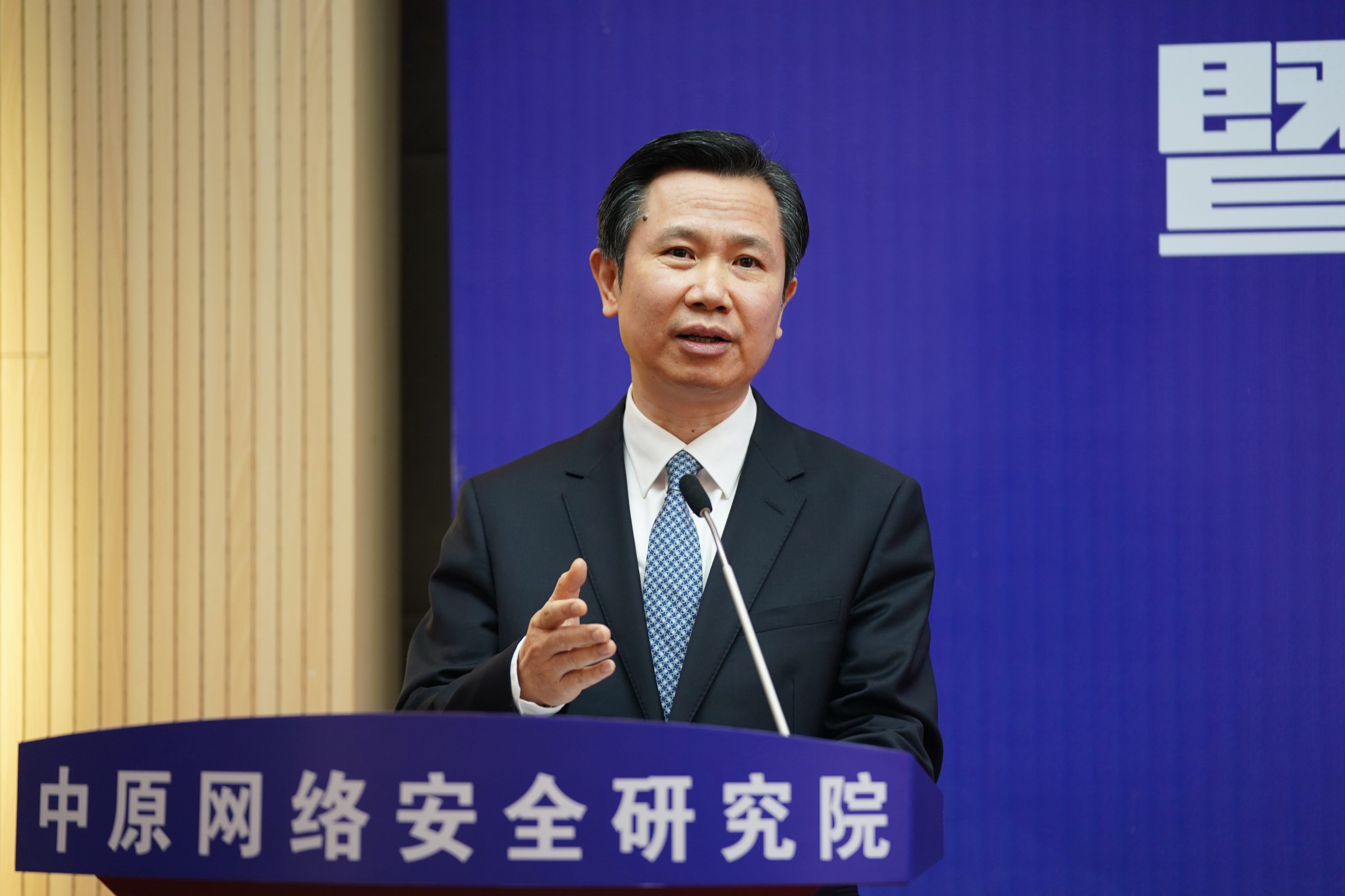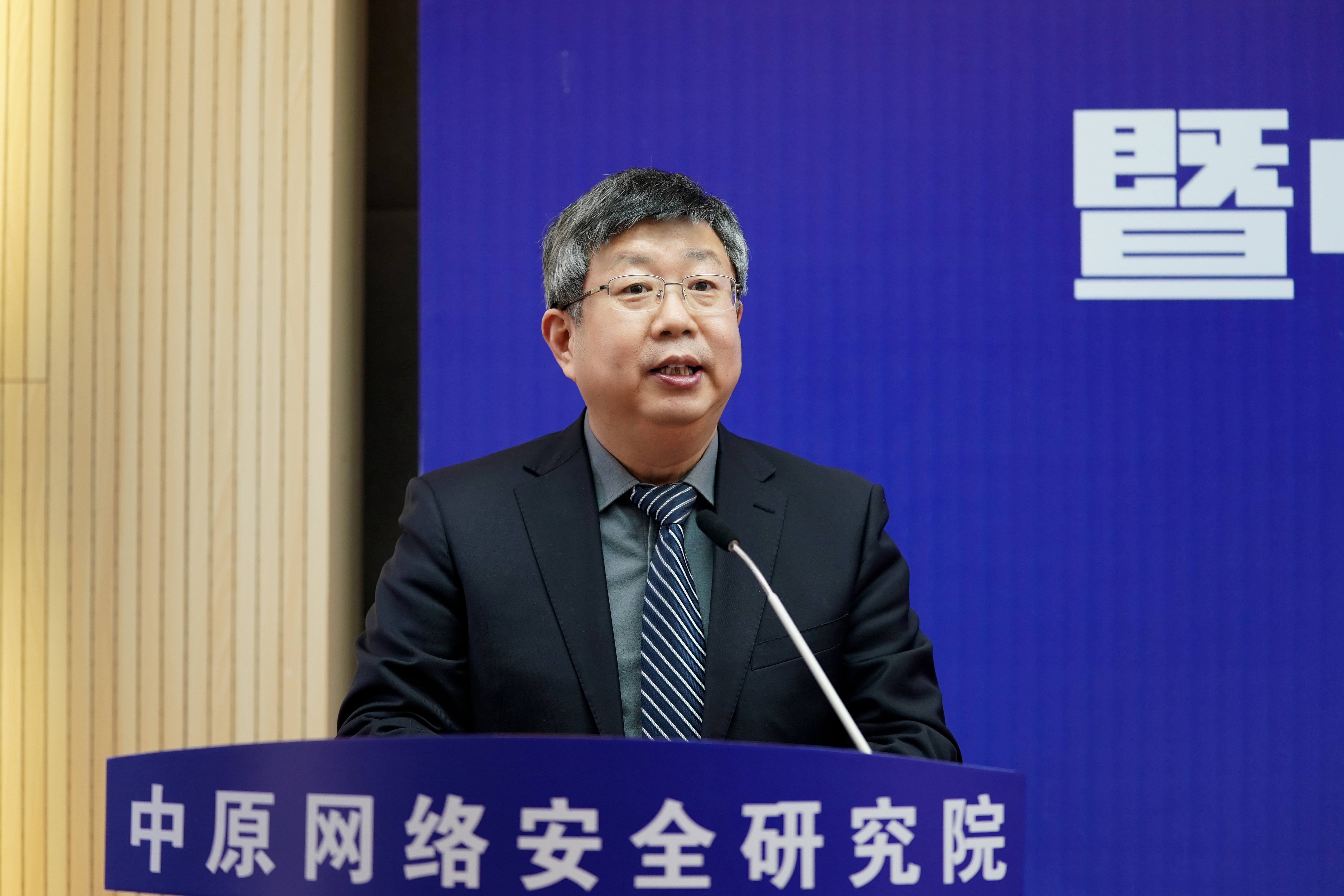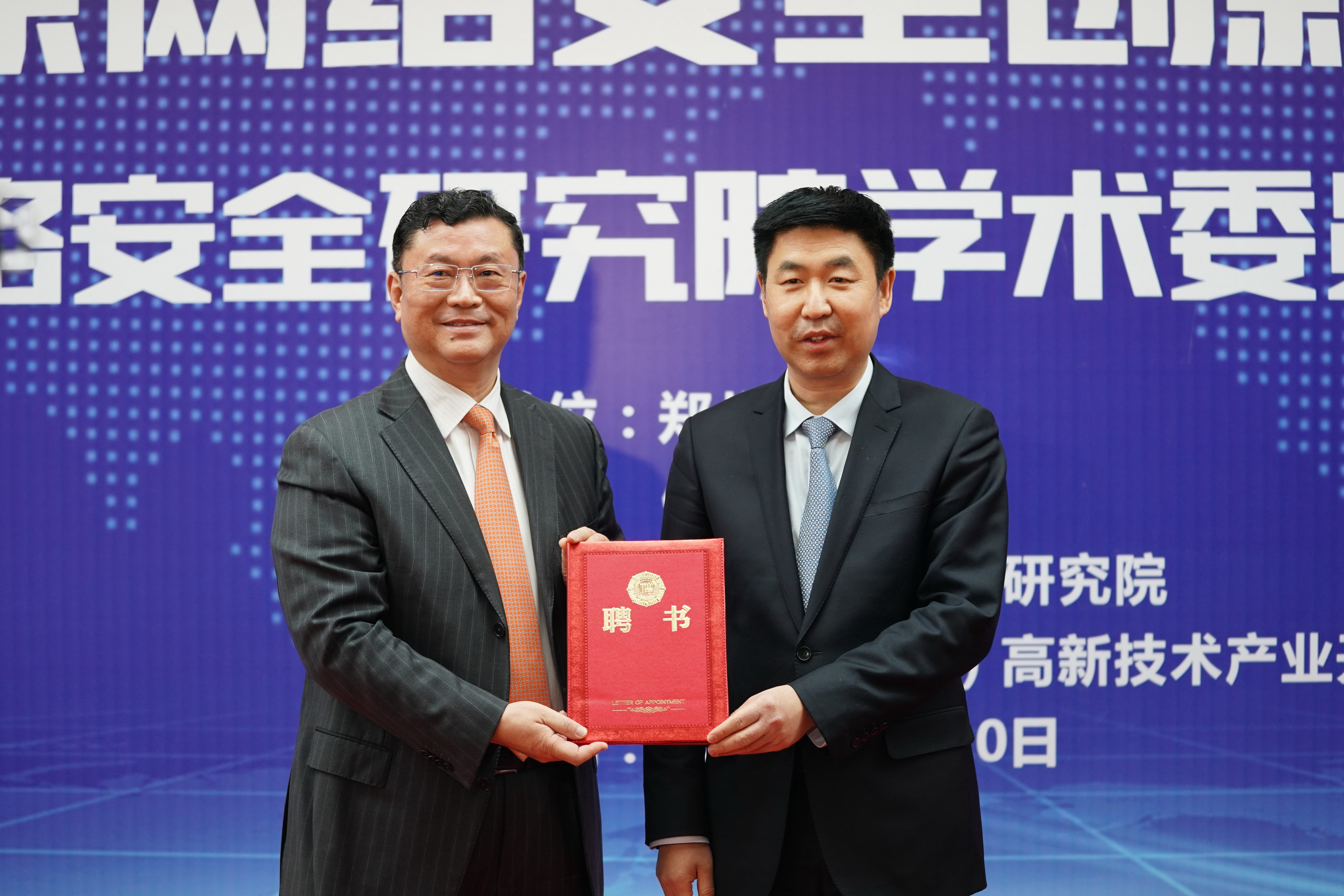 宋争辉为中原网络安全研究院院长胡传平、副院长石磊、索敏杰、张大龙颁发了聘书。梁晓婧为学术委员会主任邬江兴颁发了聘书。邬江兴和刘炯天为中原网络安全研究院揭牌。中原网络安全研究院院长胡传平汇报了研究院建设规划。
