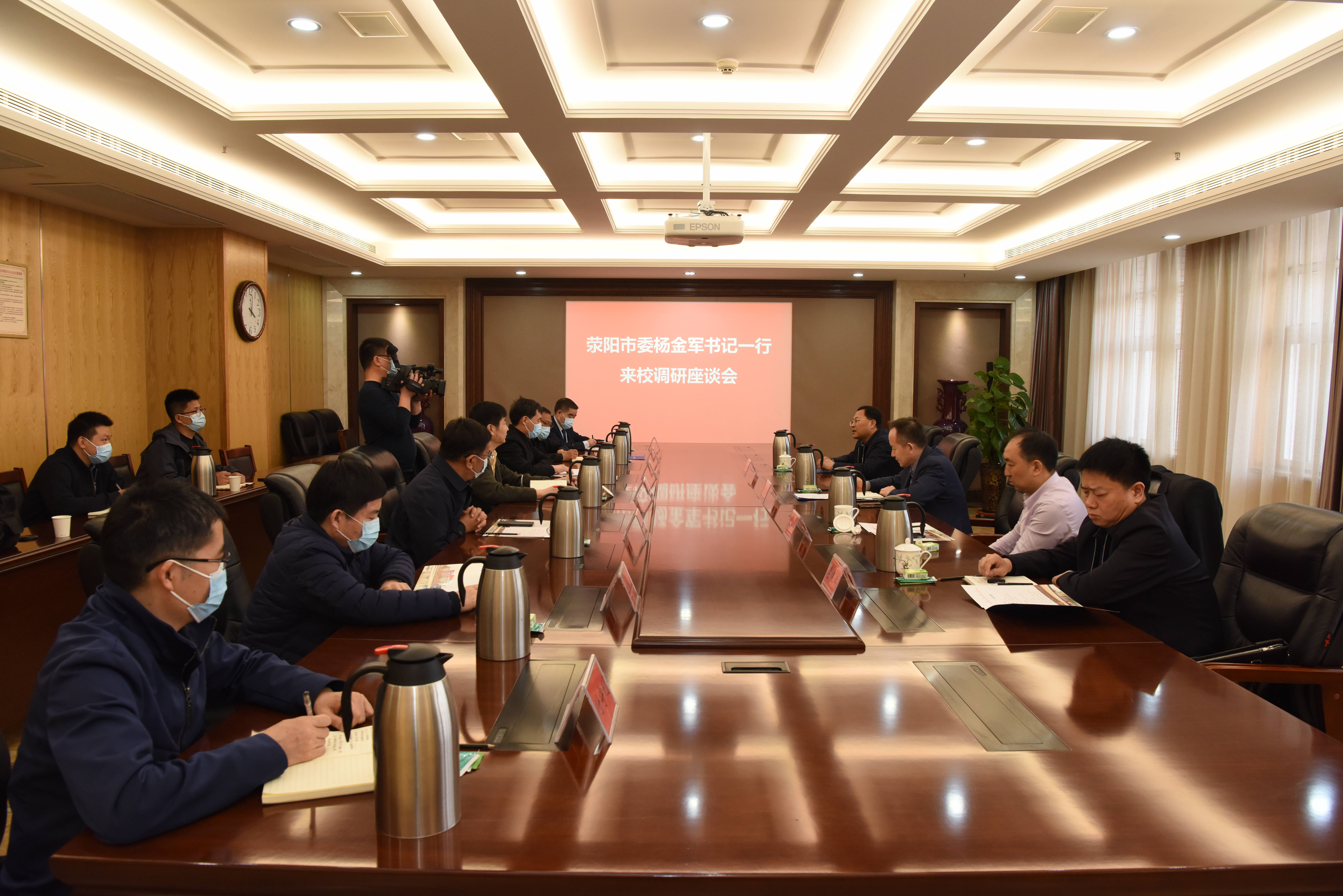 2月22日,荥阳市委书记杨金军一行来校进行访问,校党委副书记、副校长王宗敏,副校长赵明皞会见来访客人。双方开展座谈交流,探讨深化校地合作事宜。