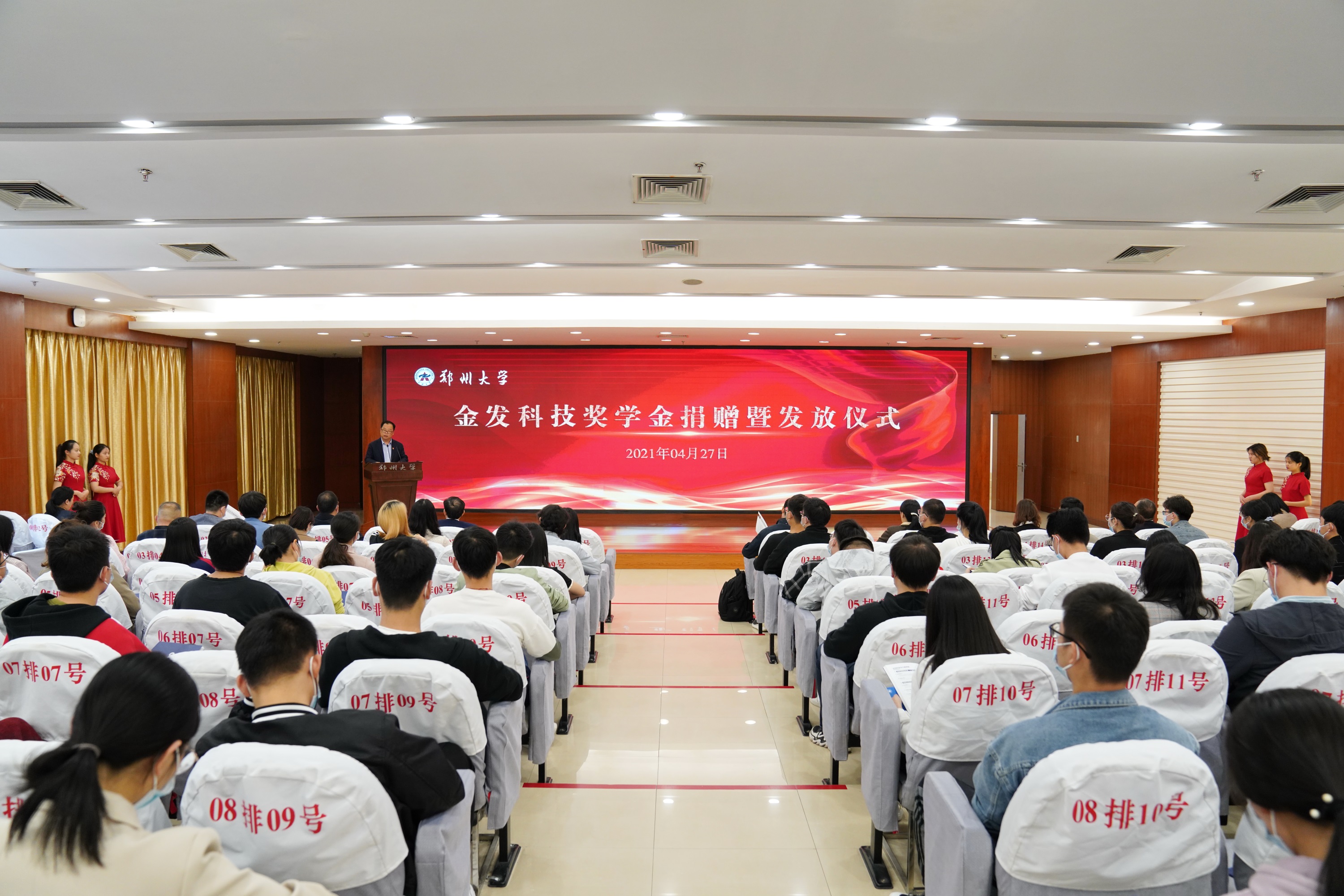 4月27日下午,bat365在线中国官网登录入口金发科技奖学金捐赠暨发放仪式在主校区举行。金发科技股份有限公司首席技术官黄险波、副总工程师刘奇祥、人力资源部招聘经理吴佩环,校党委常委、总会计师徐东升出席仪式,学校相关单位负责同志及师生代表近150人参加。