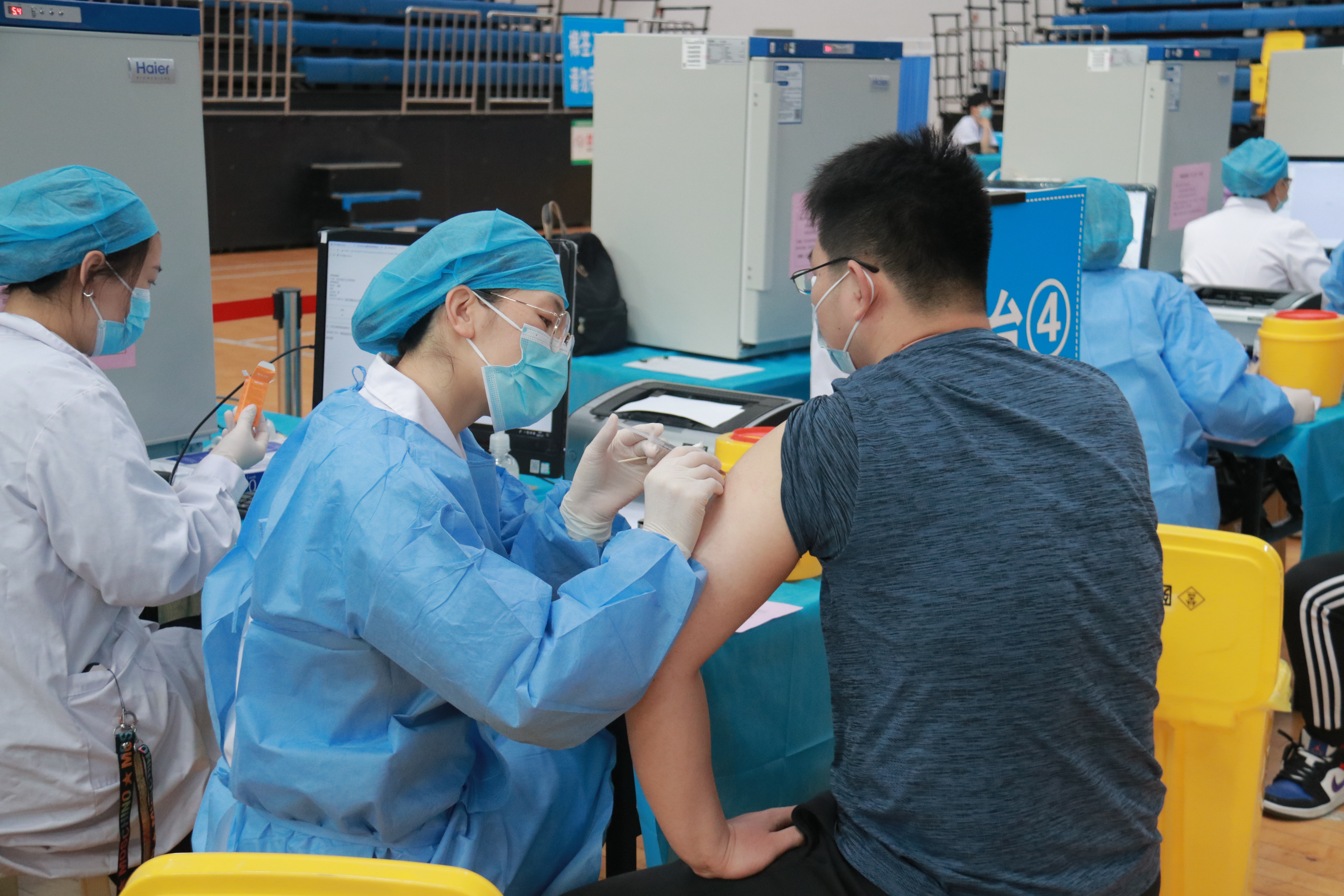 主校区疫苗接种点设置在中心体育馆,现场设置候诊区、登记区、接种区、留观区、冷链区、应急处置区等6个区域,指示牌遍布全场。各个分区都设有志愿者,主动为师生提供帮助。