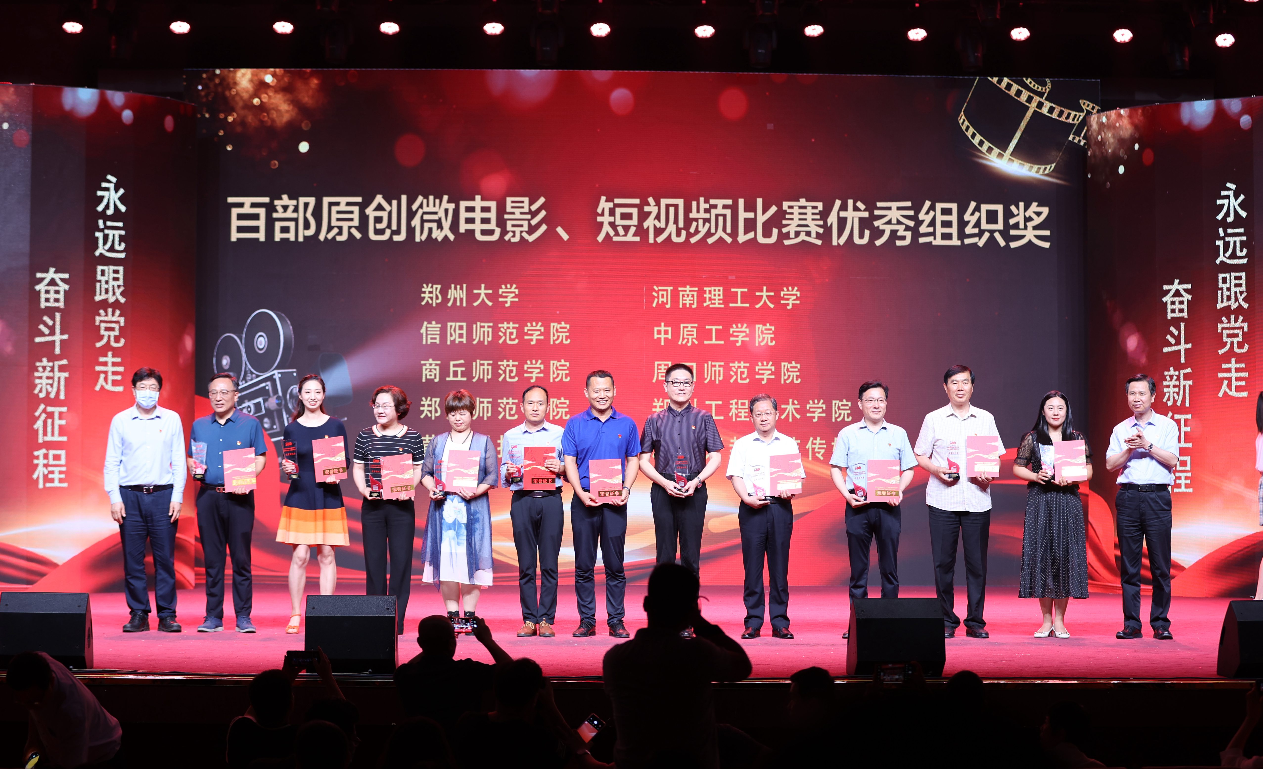 此次活动中精选“100部电影讲课堂”“红动中原跨越时空的思政课”系列活动中的优秀获奖作品,经过精心包装设计集中展演。“100部电影进课堂”活动自4月1日启动以来,征集并公布了100部经典电影目录,在此基础上,78所高校报送了1022部红色经典电影剪辑作品,60余所高校报送了462部原创短视频及微电影作品。其中新闻与传播学院报送的红色经典电影剪辑作品《永不消逝的电波》、原创短视频《秀美郝堂—茶香里的婉约》分别荣获该类别一等奖。此外,在“红动中原跨越时空的思政课”河南省高校学生参演革命电影微视频展播活动中,马克思主义学院选送的《血战湘江》荣获该类别最佳思政点评奖。bat365在线中国官网登录入口还荣获“百部经典红色电影剪辑比赛”和“百部原创微电影、短视频比赛”优秀组织单位,新闻与传播学院宗俊伟老师荣获优秀指导教师奖。与会领导分别为获奖单位代表颁奖。