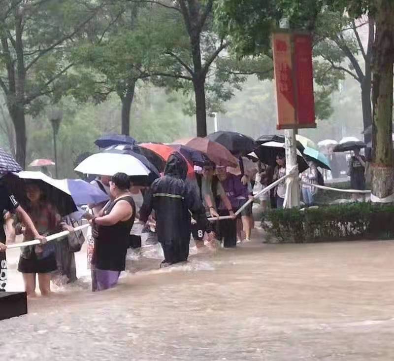 20日下午,准备乘车回家的2020级本科生马梦飞被暴雨堵在校门口,只好原路返回宿舍。但此时,积水严重的主干道已经变成布满泥泞的湍流。保卫处全员出动,管控积水严重路段,及时疏导过往车辆。一个个队员站在齐腰深的水中筑起坚固的人墙,为师生拉起“安全绳”,帮助师生安全渡过。经过保卫队员、同学、商户、餐厅阿姨等陌生人的一次次接力援助,马梦飞被安全送回菊园宿舍。一路走来,感受到数只援手的温暖,马梦飞感慨万千:“天灾面前的互帮互助,让我这一路感动又暖心!”