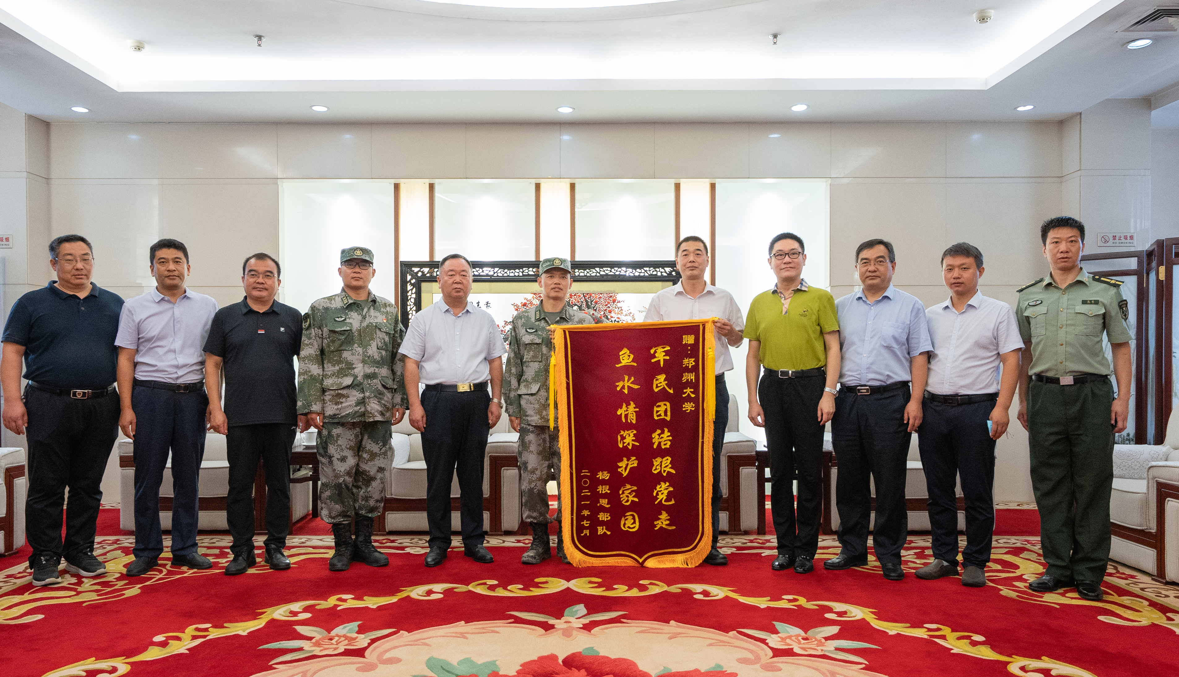 吴宏阳代表学校对翟继群一行表示热烈欢迎,并简要介绍了学校一流大学建设情况。他表示,“杨根思部队”是一支具有光荣革命传统的英雄部队,铁心向党、英勇善战、威震敌胆、功勋卓著,是百旅之杰、钢铁雄师、军中精锐。特级战斗英雄杨根思生前留下的“不相信有完不成的任务,不相信有克服不了的困难,不相信有战胜不了的敌人”“三个不相信”战斗宣言,体现了革命军人舍我其谁的使命担当、愈挫愈勇的意志品格、敢打必胜的血性底色,气吞山河,感动着无数中华儿女,激励着官兵们奋勇向前。吴宏阳指出,英雄部队入驻郑大,极大地提振了全校师生防汛抗灾的信心,坚定了必胜的信念,给学校发展带来了强大的正能量。吴宏阳强调,一要保障有力,为部队做好后勤支援工作,解决好官兵们的用餐、饮水、住宿、洗浴、用电、通讯等问题,全力为官兵排忧解难,解决好后顾之忧;二要学习到位,抓住并用好英雄部队入驻机遇,赓续革命传统、传承红色基因,将“三个不相信”融入到思政课堂中、融入到党史学习教育中,从“三个不相信”中汲取奋进力量,努力培养堪当民族复兴大任的时代新人;三要深化合作,进一步发扬拥军传统,在党史学习教育、国防教育、新生军训、大学生应征入伍等方面,加强联系、发挥优势、联学联讲、双拥共建,积极探索新形势下军校合作新模式,谱写新时代军民团结一家亲崭新篇章。