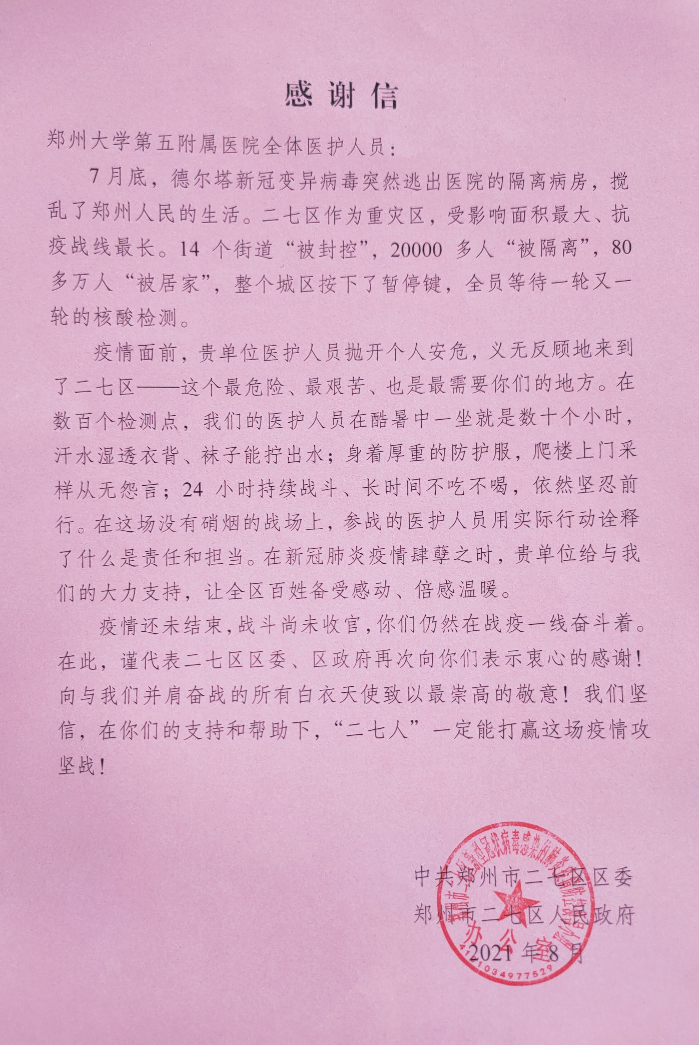 近日,在郑州市二七区长江路街道孙八砦名门丽橙苑核酸采集点及台胞社区爱尔眼科、核酸检测采样点现场,郑州市卫生健康委副主任杨德林、二七区副区长林海慰问了bat365在线中国官网登录入口第五附属医院正在工作的核酸采集队员,二七区委常委、宣传部长申宏涛代表区委、区政府为五附院送上感谢信,感谢医院为二七区疫情防控工作所做出的积极贡献。