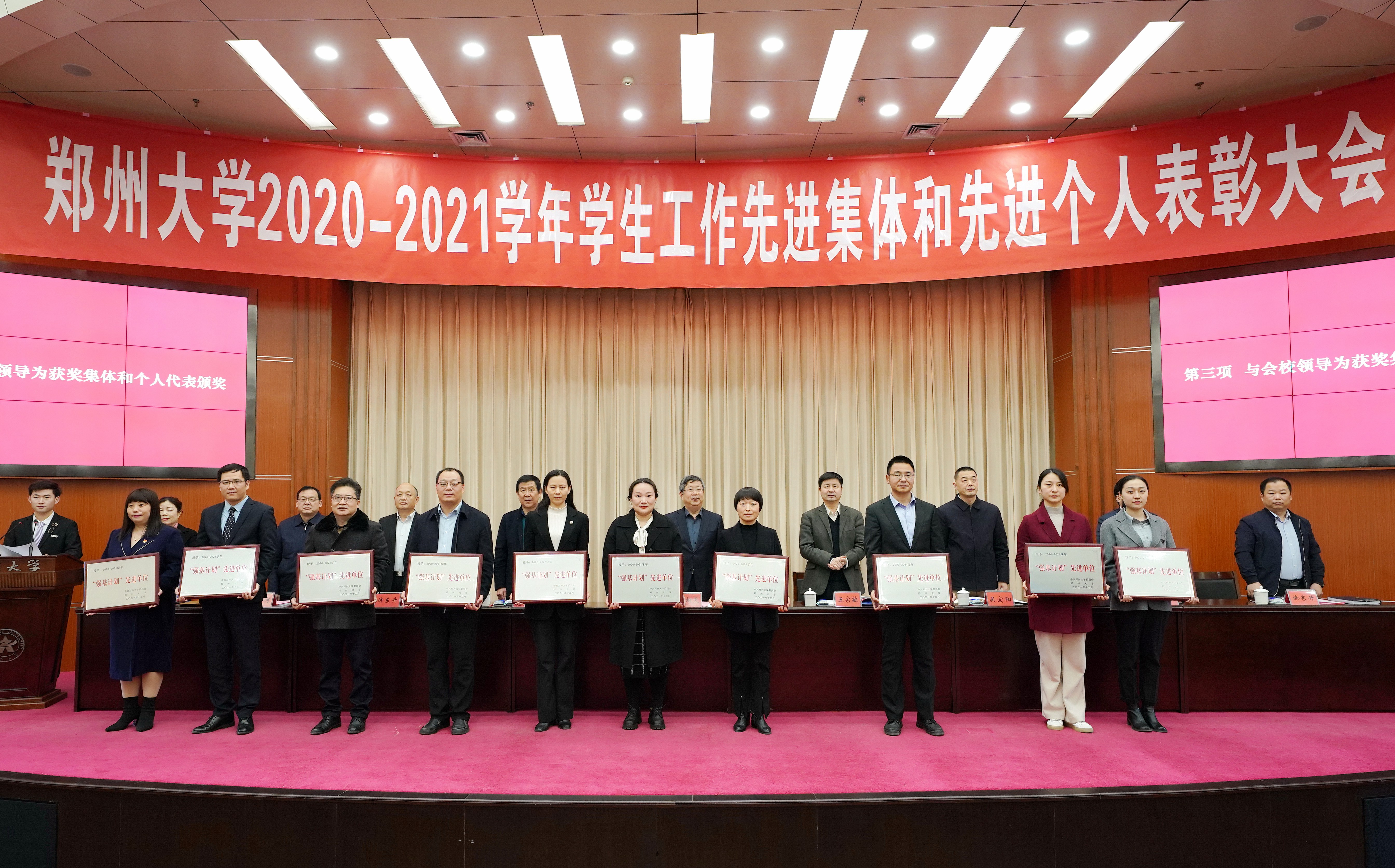 与会领导为“学生工作先进单位”“研究生学生工作先进单位”“强基计划先进单位”“大学生社会实践活动优秀组织单位”“毕业生就业工作先进单位”“大学生创业工作先进单位”“优秀本科生辅导员”“优秀研究生辅导员”“强基计划先进工作者”“大学生标兵”“十佳研究生”“三好学生(本科生和研究生)”“优秀学生干部(本科生和研究生)”等先进集体和先进个人代表颁奖。
