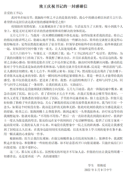 5月9日凌晨3点多,口腔医学院2018级学生郑姝瑶腹部绞痛,凌晨5点多加重,来冲冲紧急联系120送至郑大一附院急救处理。口腔医学院党委书记王庆祝得知情况后,立马赶往医院,亲自陪同并协调医院做好应急处置,根据病情协调办理了住院手续,全程陪同做CT诊断、取药、接热水。学生和家长十分感激,学生给王书记写了一封饱含深情的感谢信,在信中说到:“您一直一直陪着我直到我结束治疗,值班护士一度认为您是我的母亲。您还给远在家中的妈妈打了电话解释情况,提供了后续方案来一起商量对策,让我的家人放下心来。丝毫没有我想象中一院之长的距离感,反而是让我感受到了封校这么久以来,在我身边最切切实实的温暖......”经过治疗,目前该生病情稳定并好转。