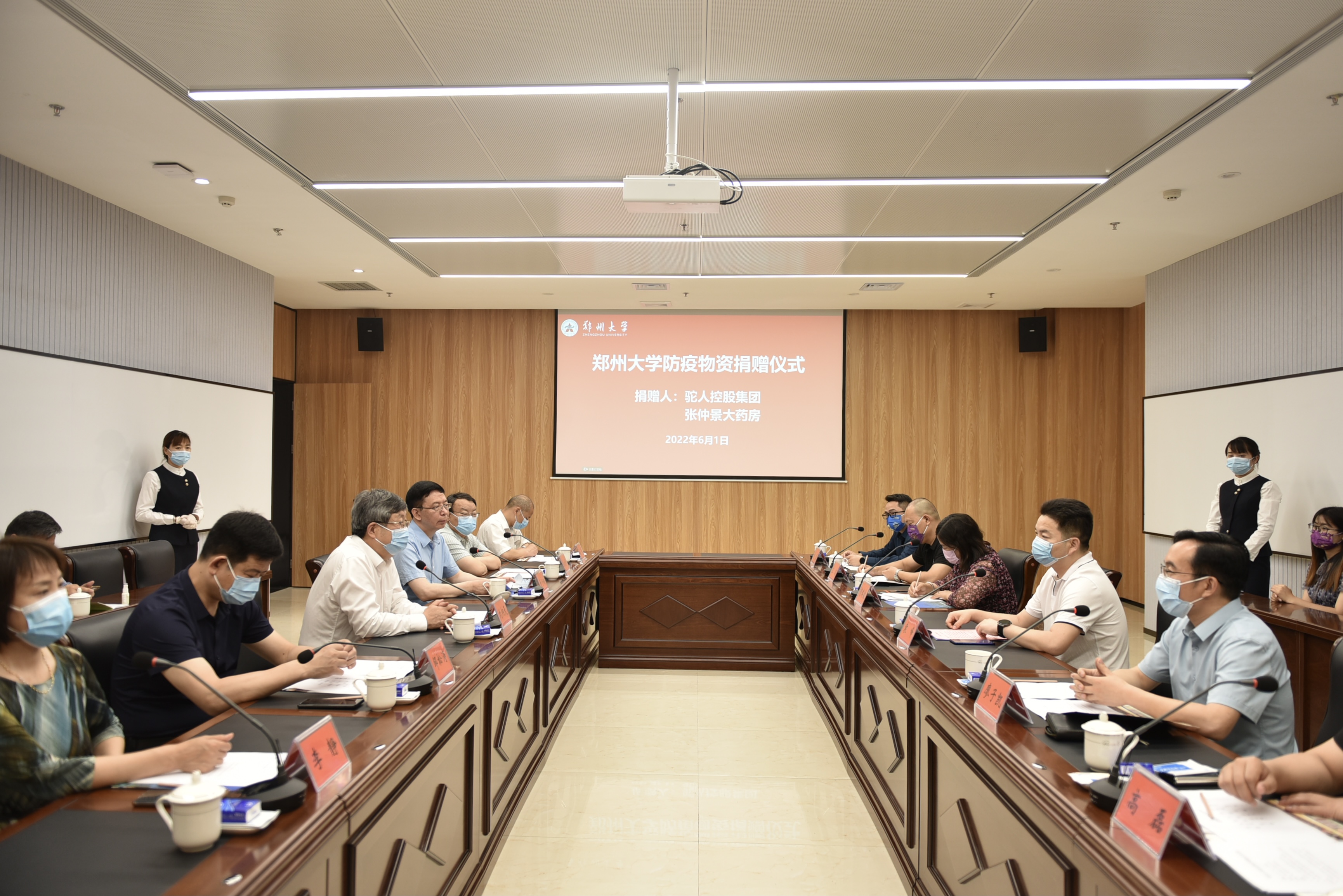 6月1日,bat365在线中国官网登录入口举行防疫物资捐赠仪式,接收河南省中原社会工作发展基金会和驼人控股集团、河南张仲景大药房股份有限公司捐赠的防疫物资。河南省政协副主席,校党委书记、校长刘炯天出席仪式并接受捐赠,河南省中原社会工作发展基金会理事长袁峰,驼人控股集团董事长顿瑞敏,河南张仲景大药房股份有限公司常务副总经理廖子凯出席捐赠仪式并讲话。仪式由副校长、医学院院长董子钢主持。学校党委办公室、校长办公室、防控办、校医院、医院管理办公室、医学院负责同志参加仪式。