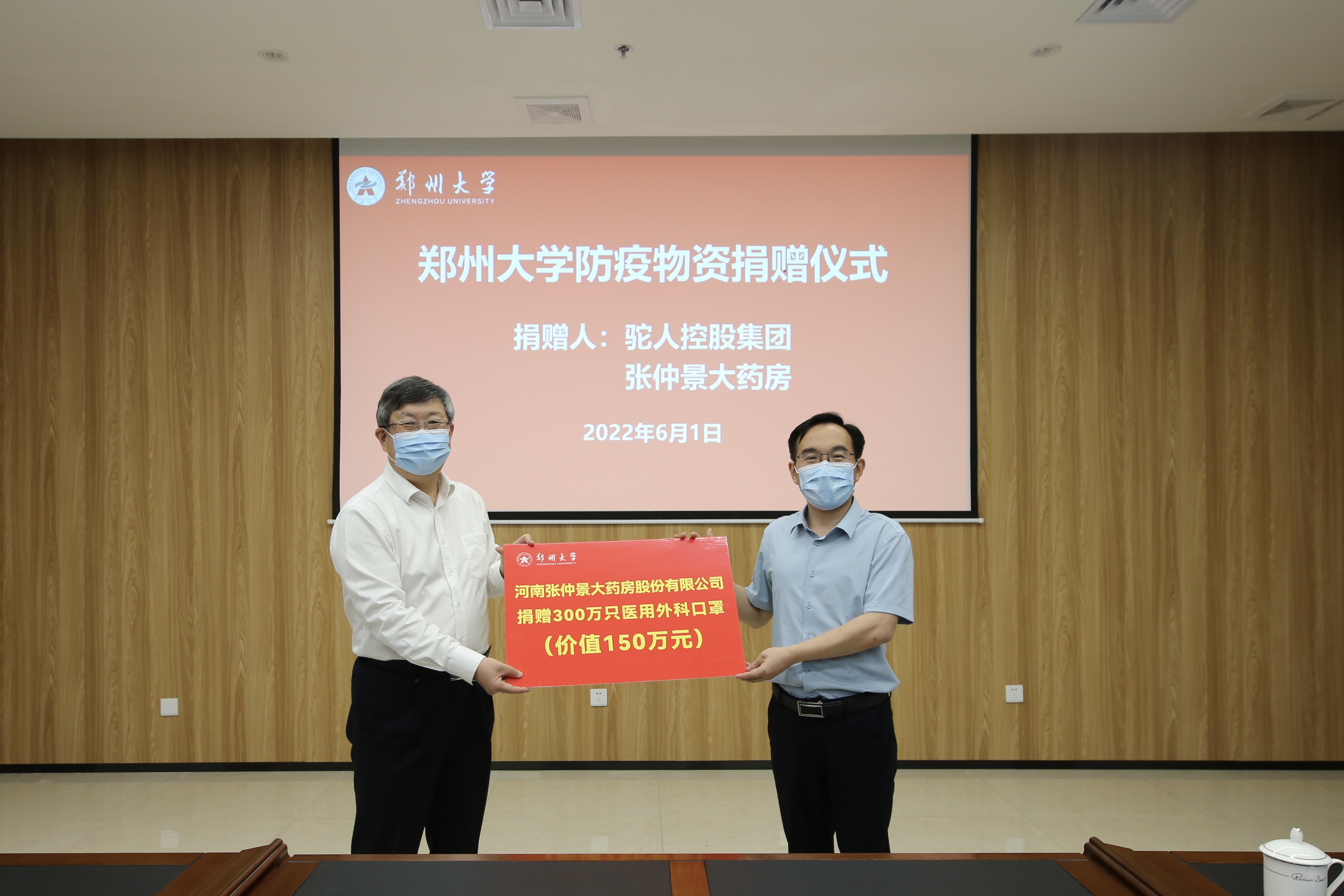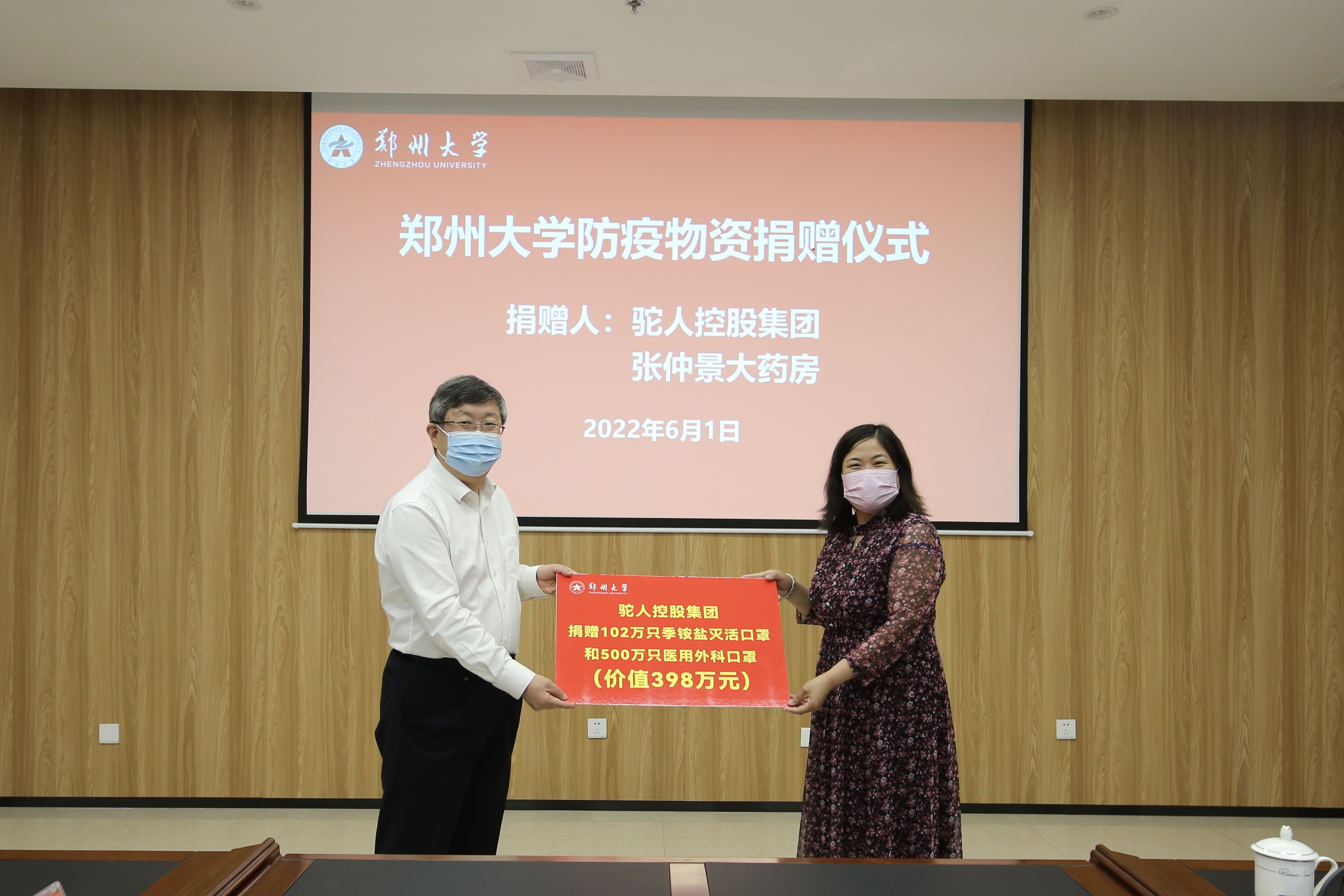 本轮疫情发生以来,学校坚决贯彻省委省政府和属地疫情防控要求,采取果断措施,全力以赴维护师生安全,同时发挥附属医院优势,组织医护工作者支援全国全省疫情防控大局。bat365在线中国官网登录入口师生的安全、附属医院医护工作者逆行出征的壮举引起着社会各界的关注和关心。此次,驼人控股集团、河南张仲景大药房股份有限公司,通过河南省中原社会工作发展基金会,向学校捐赠一批防疫物资:驼人集团捐赠季铵盐灭活口罩102万只、医用外科口罩500万只,价值398万元;河南张仲景大药房股份有限公司捐赠医用外科口罩300万只,价值150万元。(李林洁 撰稿 张宁 摄影)