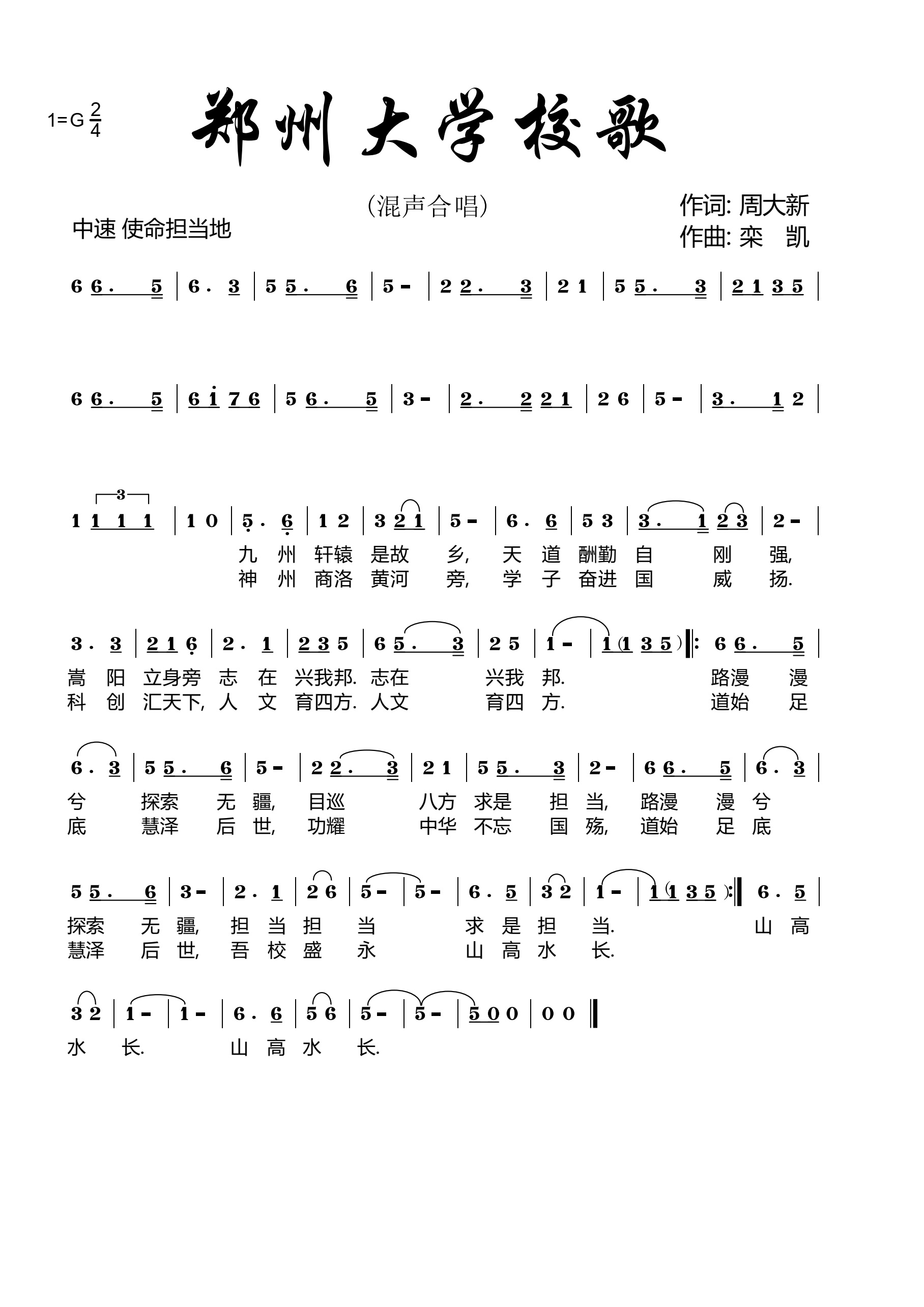 2019年以来,bat365在线中国官网登录入口通过面向全校教职工、在校学生、海内外校友,及关心、支持bat365在线中国官网登录入口建设发展的社会各界人士开展校歌征集活动,收到了一批优秀作品,后经多次研讨和慎重修改,于2021年完成了校歌创作工作。bat365在线中国官网登录入口校歌由豫籍著名作家周大新作词、著名作曲家栾凯作曲。