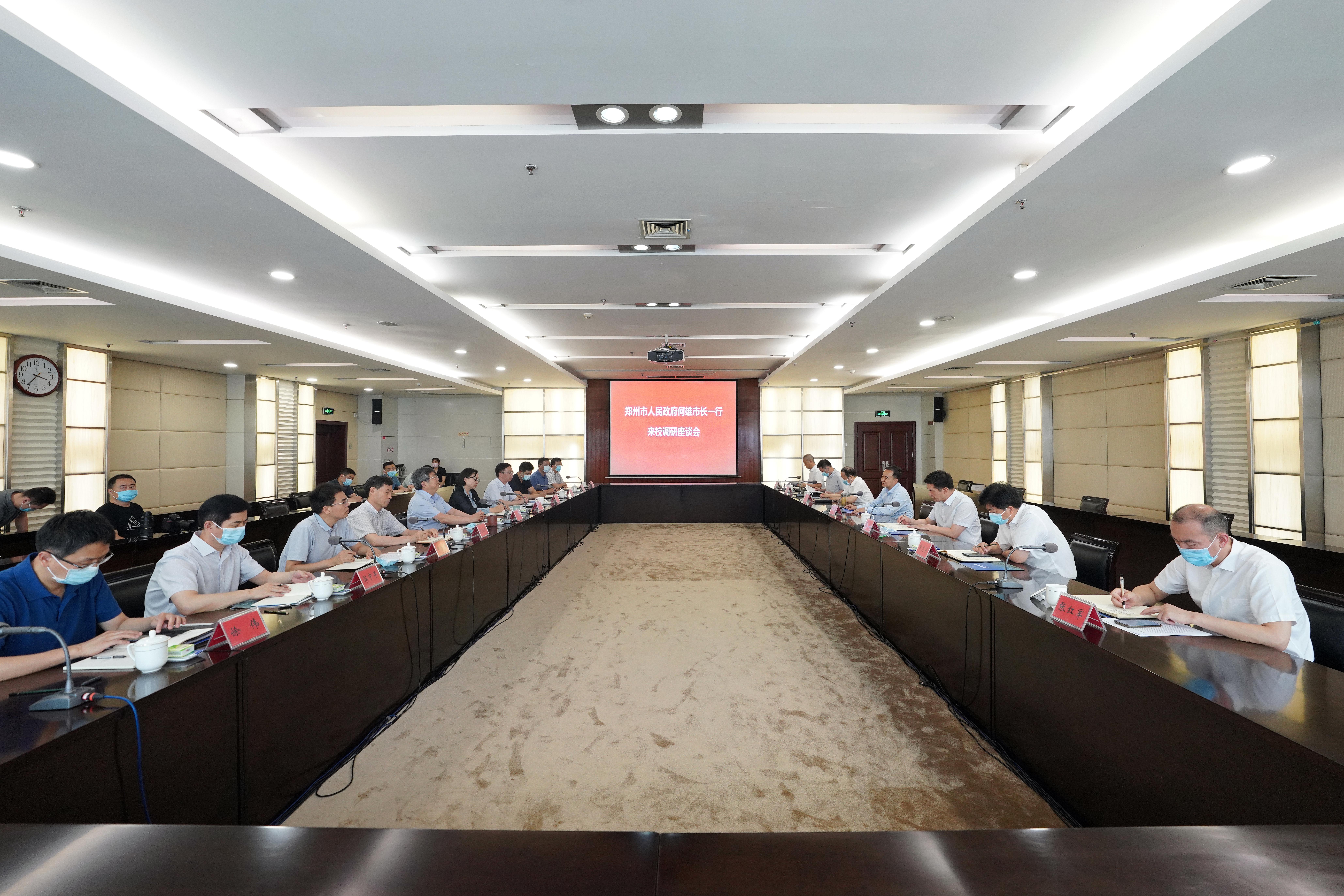 6月17日,郑州市委副书记、市长何雄到bat365在线中国官网登录入口调研座谈,深入推进名城名校融合发展。郑州市委常委、市政府党组成员虎强,省政协副主席、校党委书记刘炯天院士,校长李蓬院士出席座谈会,副校长赵明暤,学术副校长董子钢、单崇新,郑州市政府及学校相关部门负责人参加座谈。双方就加强校市协同创新、推动“双一流”建设等进行深入交流,达成广泛共识。