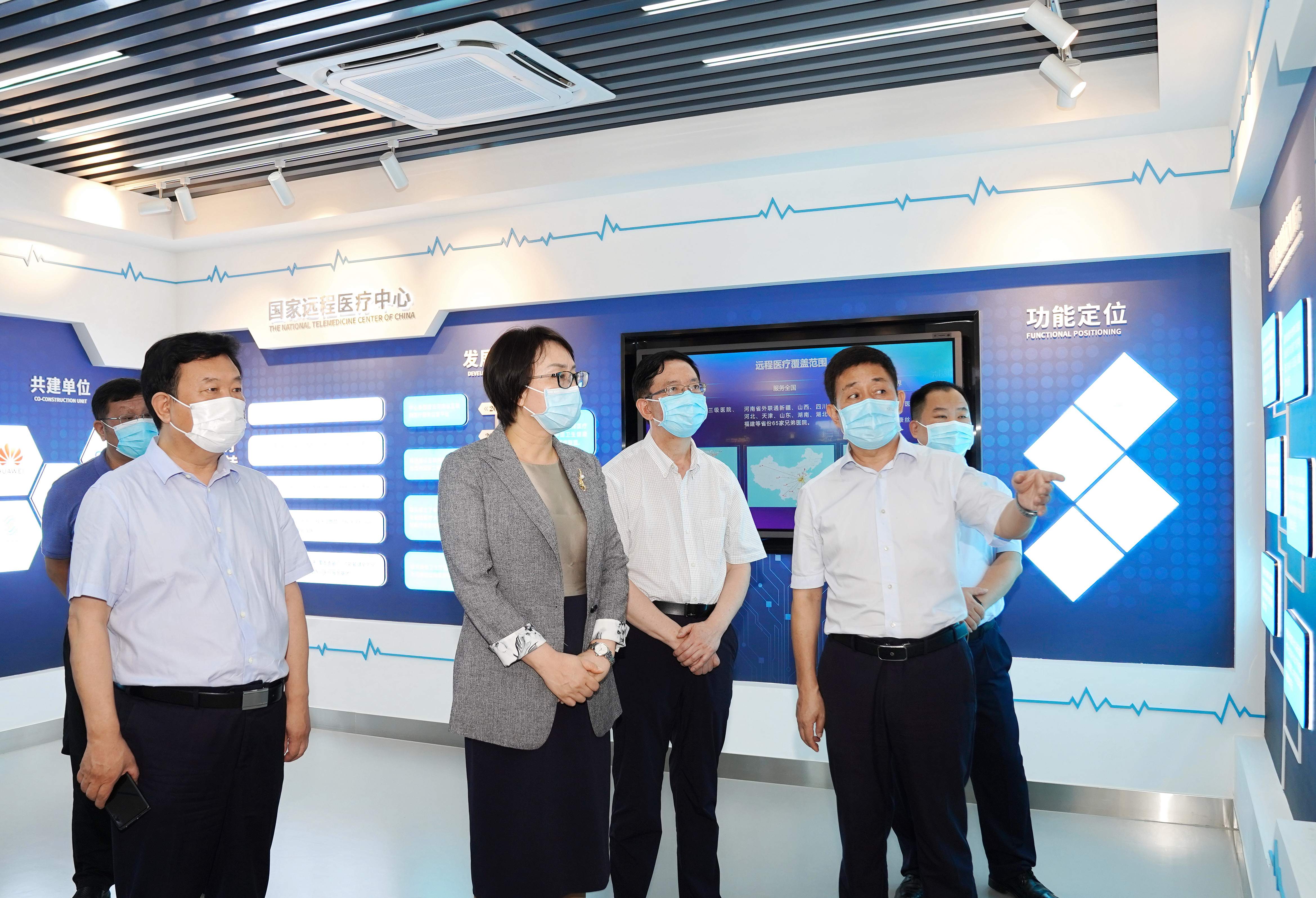 李蓬一行首先来到国家远程医疗中心(互联网医疗系统与应用国家工程实验室),深入了解实验室建设情况。她指出,要充分发挥医教研协同优势,积极推进科研立项、“医工交叉”、成果转化、智慧医疗,汇聚优质医疗资源,以科技赋能,打造一流的医学教育、科研、平台体系。