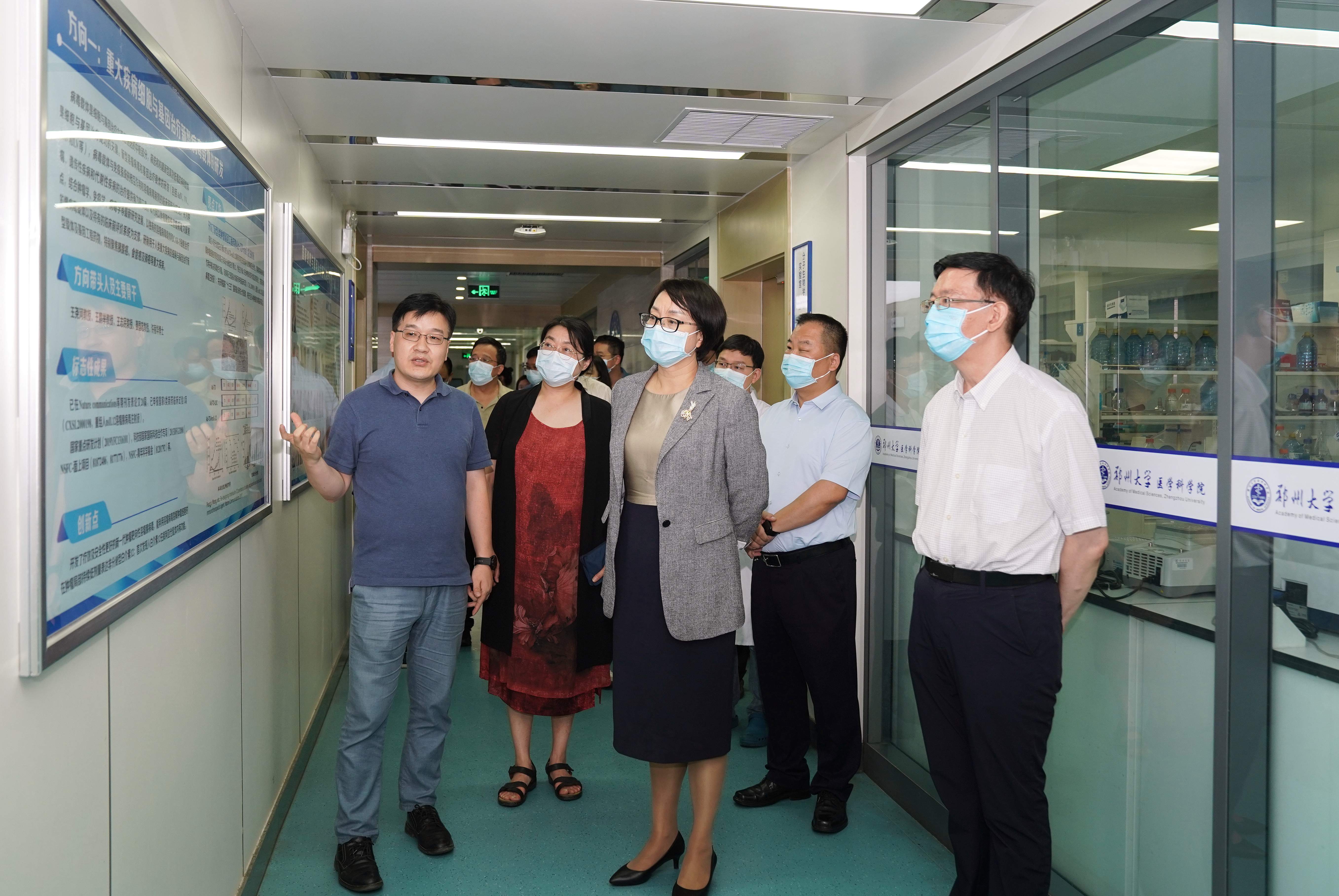 在省部共建食管癌防治国家重点实验室与医学科学院转化医学平台,李蓬与实验室负责同志、科研人员进行了深入交流,全面了解实验室和科研平台的运行机制、研究方向、梯队建设、成果产出等情况。她强调,要加强科研平台开放共享,突出重点特色,强化基础研究与临床的结合,发挥好临床资源优势,助推一流学科建设。
