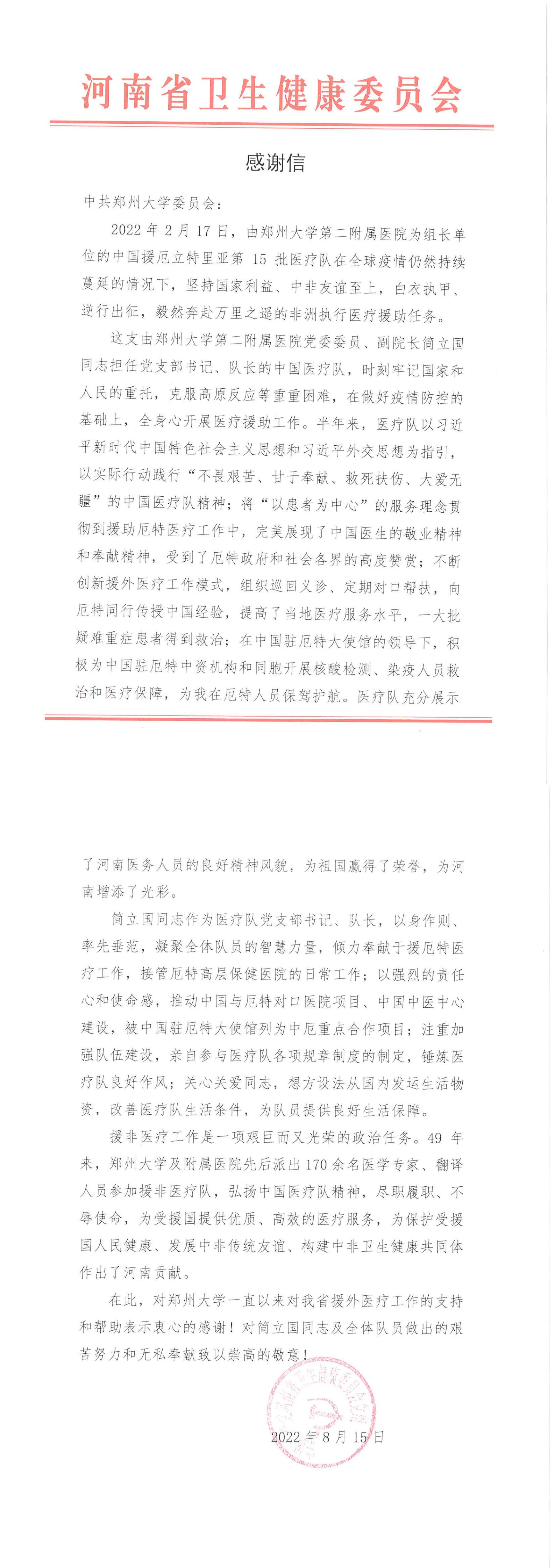 近日,河南省卫生健康委员会向学校发来感谢信。信中充分肯定了由bat365在线中国官网登录入口第二附属医院为组长单位的中国援厄立特里亚第15批医疗队在全球疫情仍然持续蔓延的情况下,坚持国家国家利益、中非友谊至上,毅然奔赴万里之遥的非洲执行医疗援助任务,对学校校一直以来对河南省援外医疗工作的支持和帮助表示衷心的感谢,对医疗队队长简立国同志及全体队员做出的艰苦努力和无私奉献致以崇高的敬意。