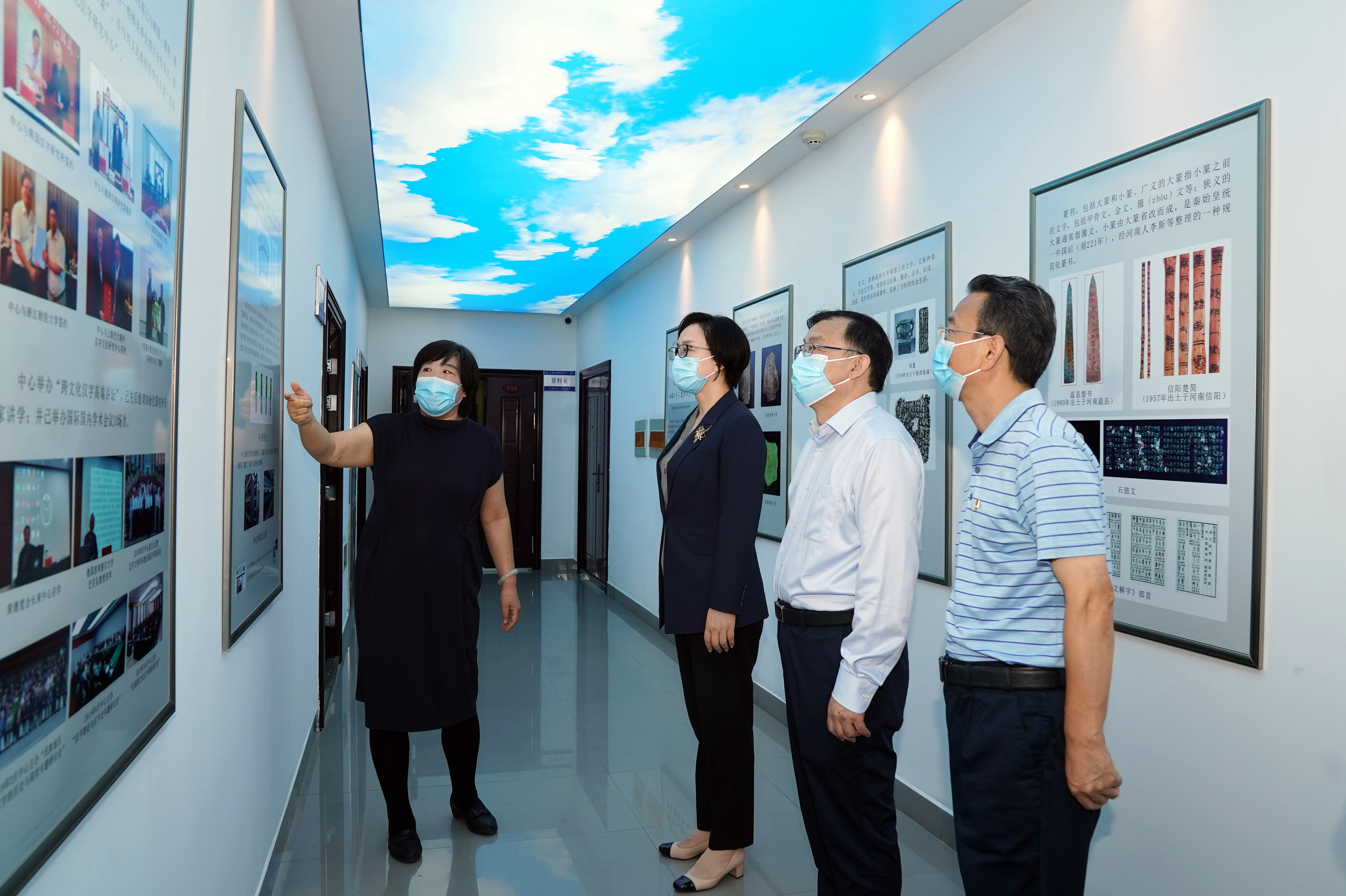 在图书馆,李蓬实地了解文献信息资源和服务功能情况,并对图书馆珍贵古文、古籍的保护工作给予肯定,同时指出要进一步加强信息化、数字化建设。在外国语与国际关系学院,她详细了解学院发展历程和建设情况,并对学院浓厚的文化育人氛围给予高度评价。在历史学院,李蓬现场察看了中原历史文化优势特色学科部分成果,参观了科技考古实验室,指出要依托中原历史文化丰富资源,加快bat365在线中国官网登录入口博物馆建设,助力学科发展。在文学院,李蓬听取了汉字文明中心建设情况介绍,对中心未来的发展提出期望。在新闻与传播学院,她重点了解穆青研究中心的建设情况,并对学院传承“勿忘人民”精神、打造特色育人项目表示肯定。