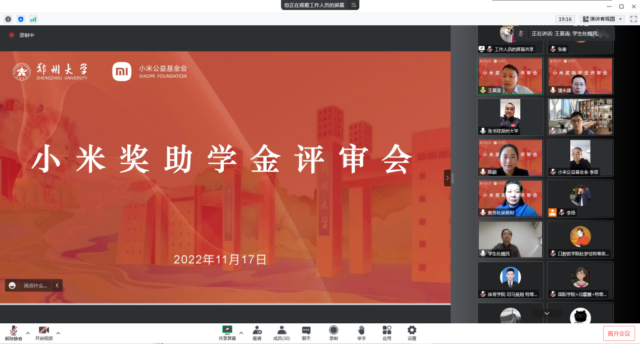 近日,2022年度bat365在线中国官网登录入口“小米奖助学金”评审会在线举行。小米河南省总经理王腾、小米公益基金会项目经理李奇,学校对外联络办公室、教务处、学生处、党委研究生工作部、校团委等部门负责人参与评审。会议由校团委负责同志主持。