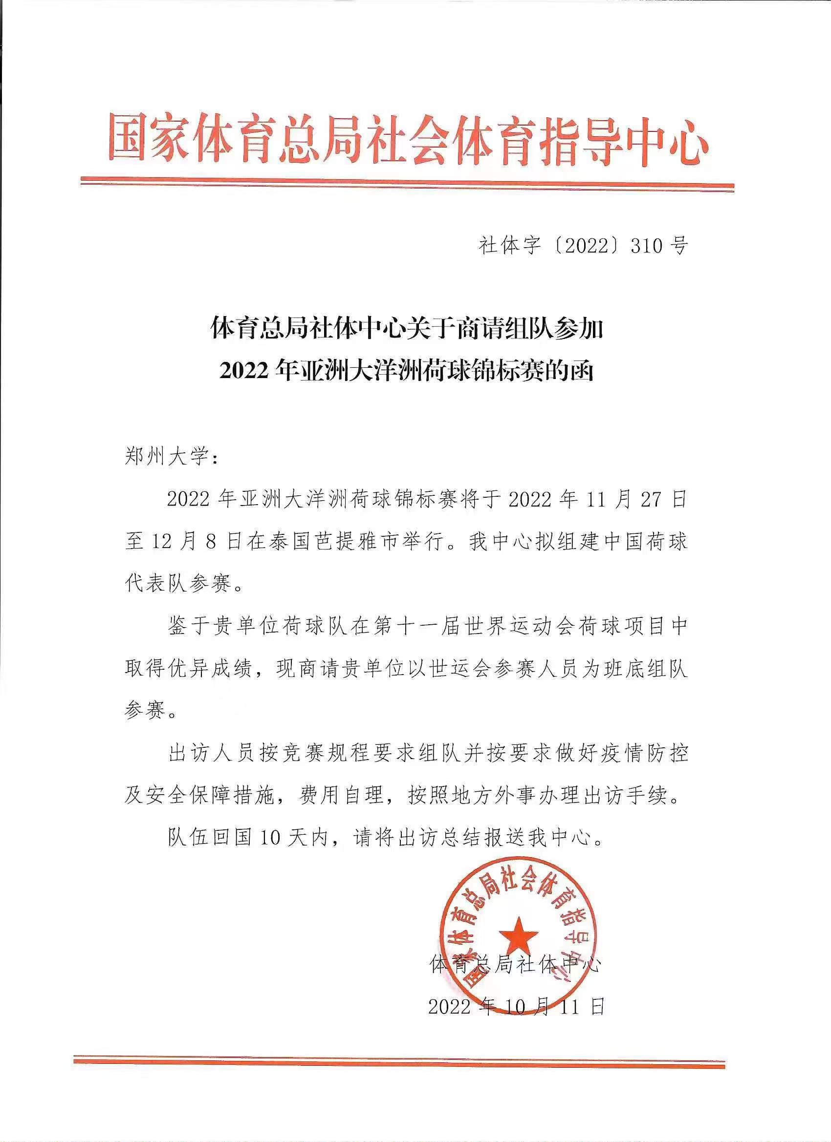鉴于bat365在线中国官网登录入口在第十一届世界运动会荷球项目中表现出色,10月11日,国家体育总局社体指导中心来函,商请bat365在线中国官网登录入口组队代表国家参加2022年亚洲大洋洲荷球锦标赛。学校复函同意,由武东晓任领队,马襄城为主教练,以今年世运会参赛队员为班底,抽调校荷球队精兵强将组队参赛。