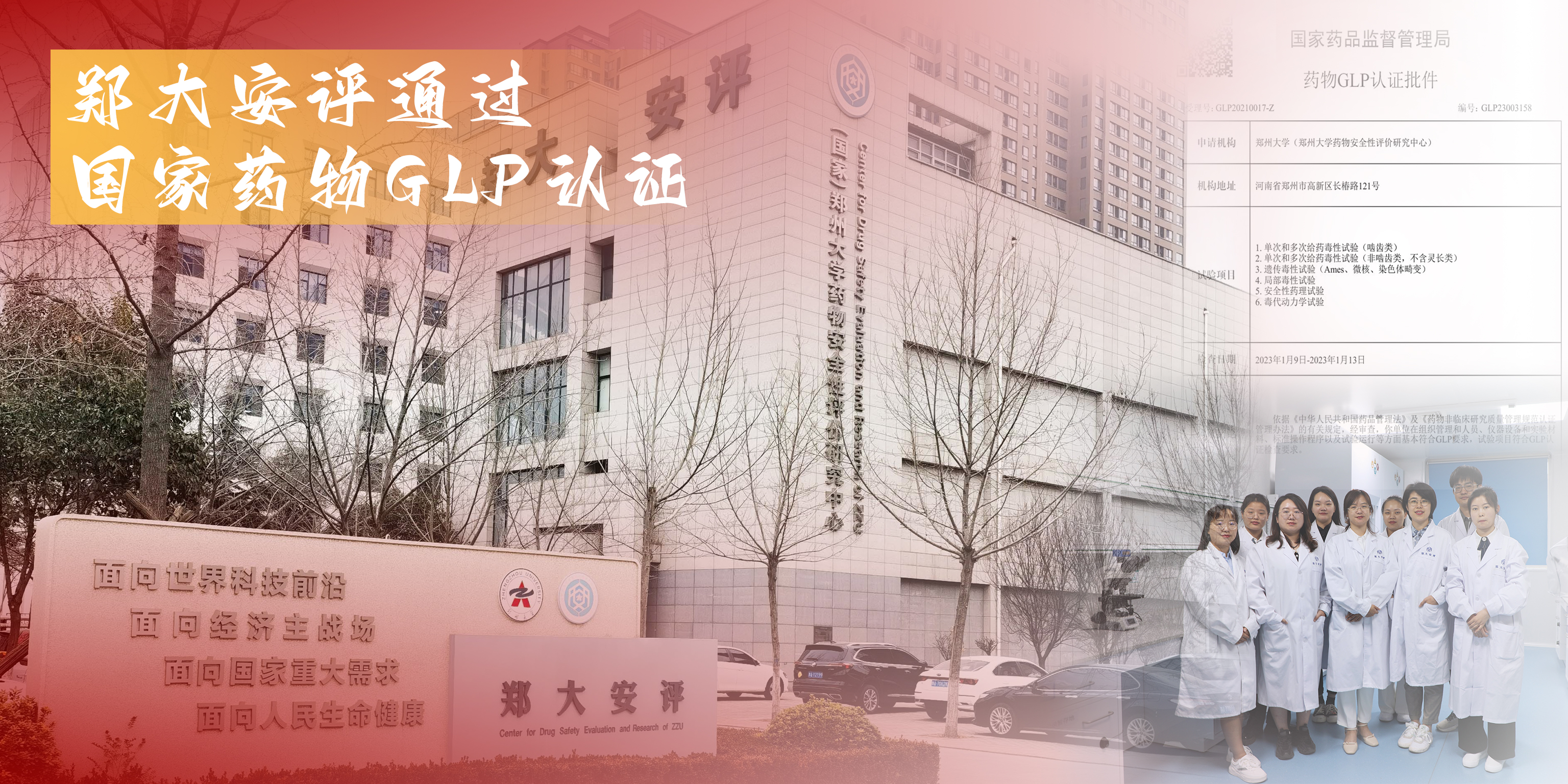 郑大安评始建于2004年。2009年,其4项试验通过国家GLP认证。2010年,因市政工程改造原因迁址至bat365在线中国官网登录入口主校区建设。2020年,为加速河南省生物医药产业的发展,打通产业链,河南省下发《2020年度河南省生物医药产业发展工作方案》,揭榜挂帅郑大安评尽快通过国家认证,由省药监局、省科技厅、省教育厅、省发改委以及bat365在线中国官网登录入口等单位作为建设责任单位。2021年9月,郑大安评正式提交GLP认证申请,并于当年12月接受国家专家组的现场检查。2023年1月,郑大安评再次接受国家专家组的现场检查。最终,经过三年的艰苦奋斗和不懈努力,郑大安评顺利通过国家GLP认证。