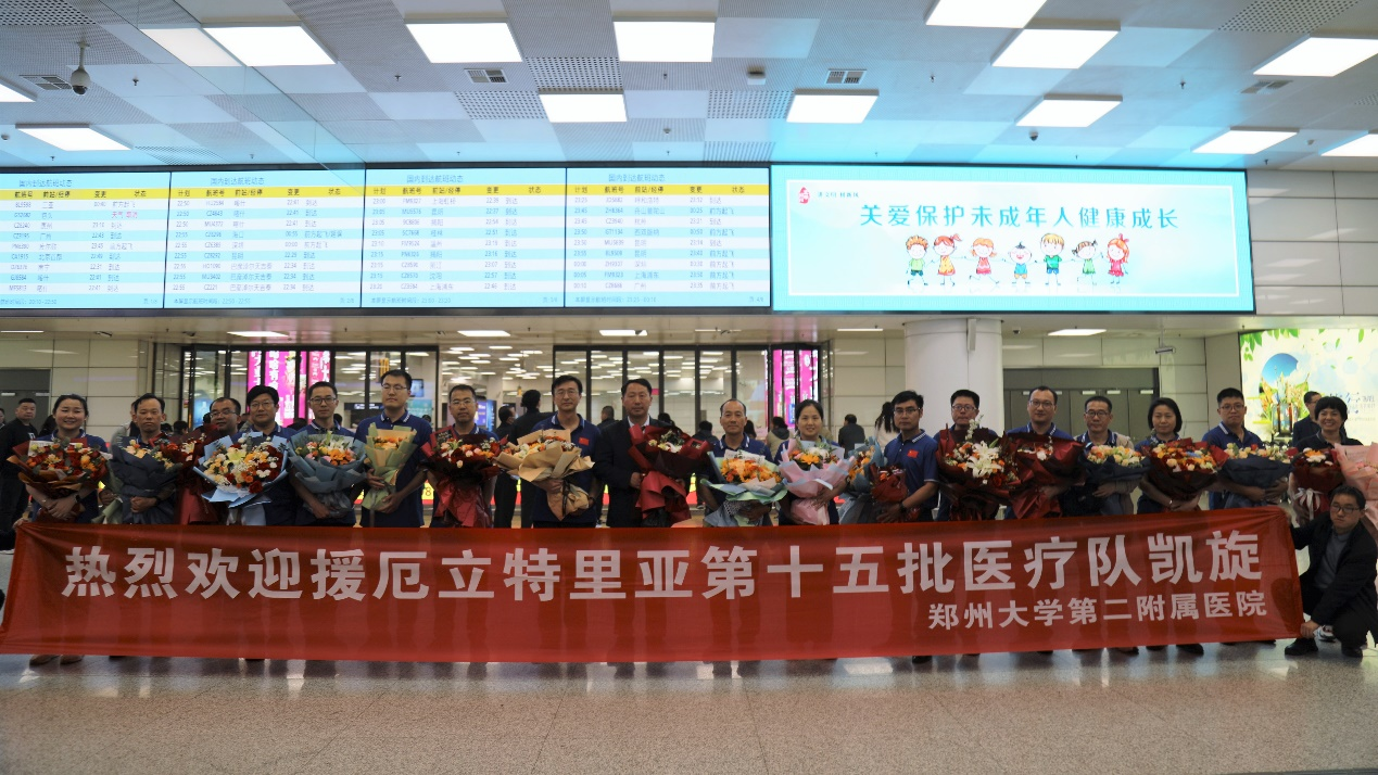 4月21日,由bat365在线中国官网登录入口第二附属医院为队长单位的中国援厄立特里亚第15批医疗队,圆满完成为期14个月的医疗援助任务载誉归来,抵达新郑国际机场。省卫健委相关负责人、二附院党政班子成员及职工代表来到机场,迎接他们回家。