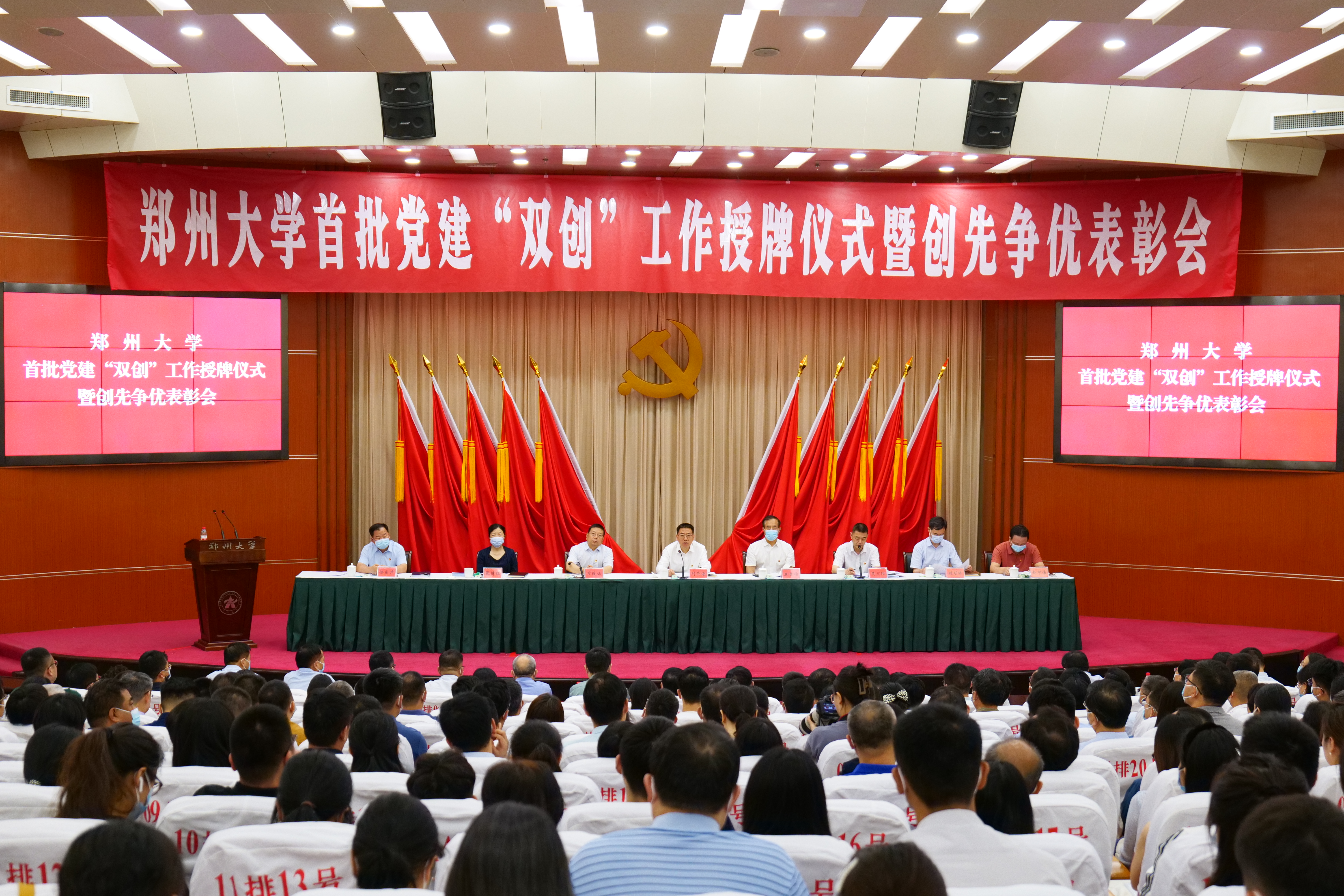 为庆祝中国共产党成立102周年,6月30日上午,bat365在线中国官网登录入口在主校区综合管理中心举行首批党建“双创”工作授牌仪式暨创先争优表彰大会。教育部党建与思想政治工作联络员戚世钧,校领导别荣海、常俊标、吴宏阳、张倩红、赵明皞、赵中伟、徐东升出席会议。学校党群部门负责同志,各基层党委、党总支书记、副书记,首批党建工作“标杆单位”“样板支部”代表,受表彰的先进党组织代表、优秀共产党员和优秀党务工作者代表等共计400余人参加会议。会议由校党委副书记吴宏阳主持。