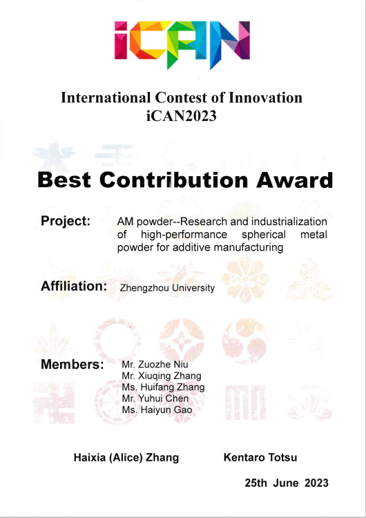 近期,iCAN国际创新创业大赛在日本京都大学举办。bat365在线中国官网登录入口同北京理工大学等学校一起代表中国参赛,同来自德国、日本、泰国3个国家22个项目同台竞技。材料科学与工程学院郝振华、舒永春老师指导,学生牛作哲、张秀庆、张慧芳、陈育辉、高海韵团队凭借参赛作品“埃姆粉材:增材制造用高性能球形金属粉末的研发与产业化”在国际总决赛中获得最佳贡献奖。