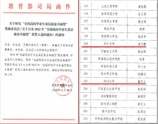 “全国高校毕业生基层就业卓越奖”是2022年由中国长江三峡集团出资,中国教育发展基金会设立,旨在引导和鼓励高校毕业生到基层建功立业、成长成才,按照教育部《关于开展2022年“全国高校毕业生基层就业卓越奖”推荐活动的通知》要求,省教育厅在全省开展了“河南省高校毕业生基层就业卓越奖”评选活动。经各高校推荐申报、专家网络评审、集中会评和公示等程序,最终确定了获奖人选。全国共确定奖励优秀高校毕业生398人,优秀指导教师60人。