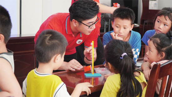 研支团志愿者赵宇在安置点陪孩子们做实验。