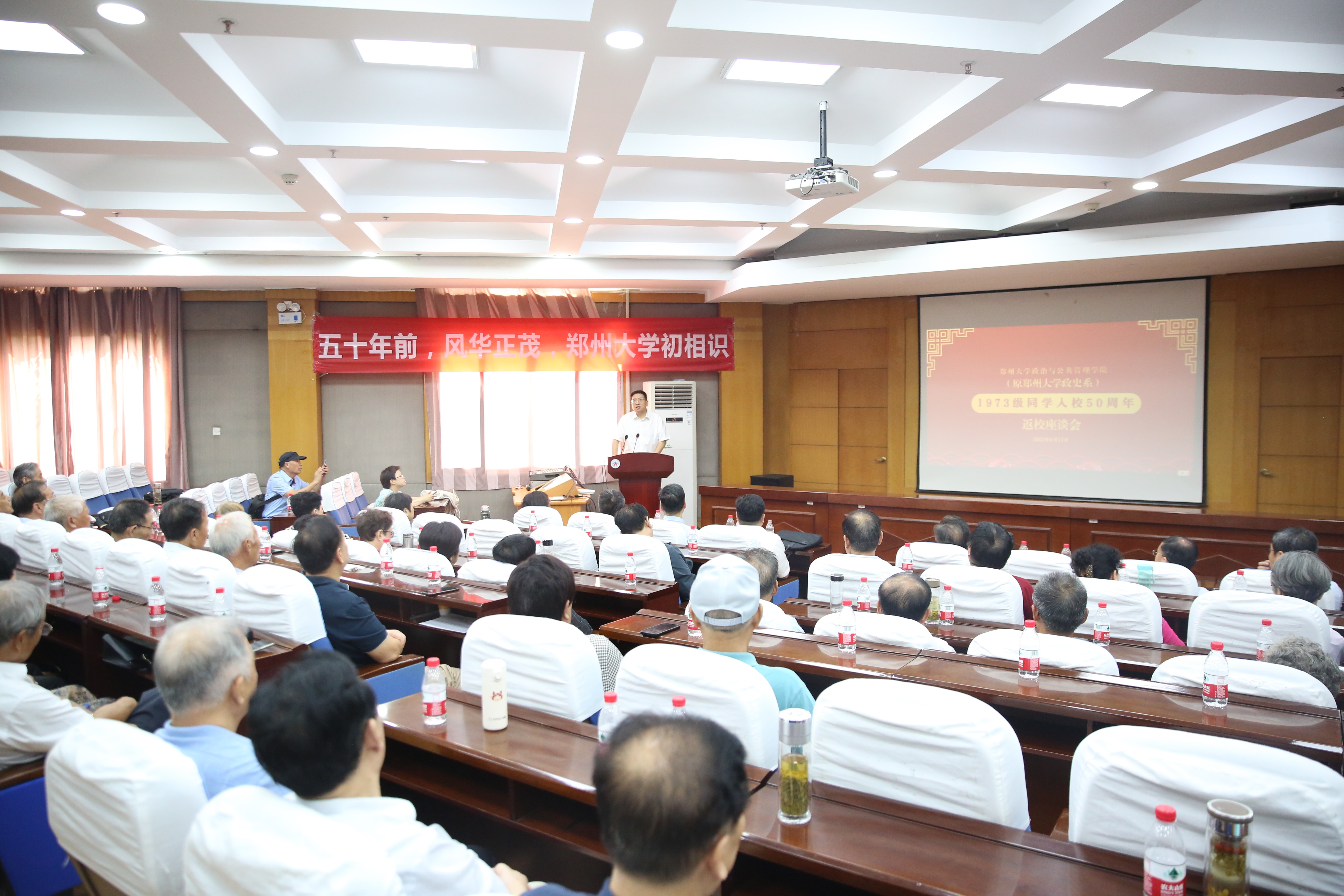 别荣海对校友返校表示欢迎,并从发展历程、师资队伍、人才培养和学科建设等方面介绍了学校发展情况。他表示,五十年前,校友们从五湖四海来到郑大,寒窗苦读终有所成;踏出校园,校友们响应时代号召,迎着改革开放的春风,在各自的岗位上勤勤恳恳、兢兢业业,为中国现代化进程奉献了青春、贡献了力量,树立了郑大形象、擦亮了郑大品牌!他指出,校友是学校建设发展的重要力量,希望广大校友能一如既往地关心和支持学校的一流学科建设,为学校、学院的科学研究、交流合作、人才培育等方面建言献策、添砖加瓦!