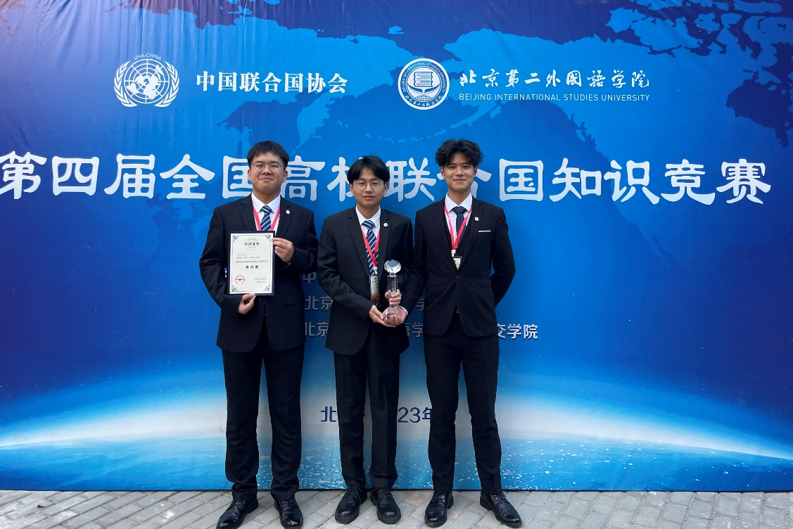 日前,由中国联合国协会与北京第二外国语学院联合举办的“第四届全国高校联合国知识竞赛”在北京第二外国语学院召开。中国联合国协会副会长兼总干事胡文丽、北京第二外国语学院党委副书记李臻出席开幕式。来自中国社会科学院大学、浙江大学、外交学院、bat365在线中国官网登录入口、国际关系学院等全国高校共计15支队伍参加比赛。政治与公共管理学院赵秀赞老师指导,由2021级本科生张德馨、王瀚生和孙明凯组成的队伍代表bat365在线中国官网登录入口参赛。