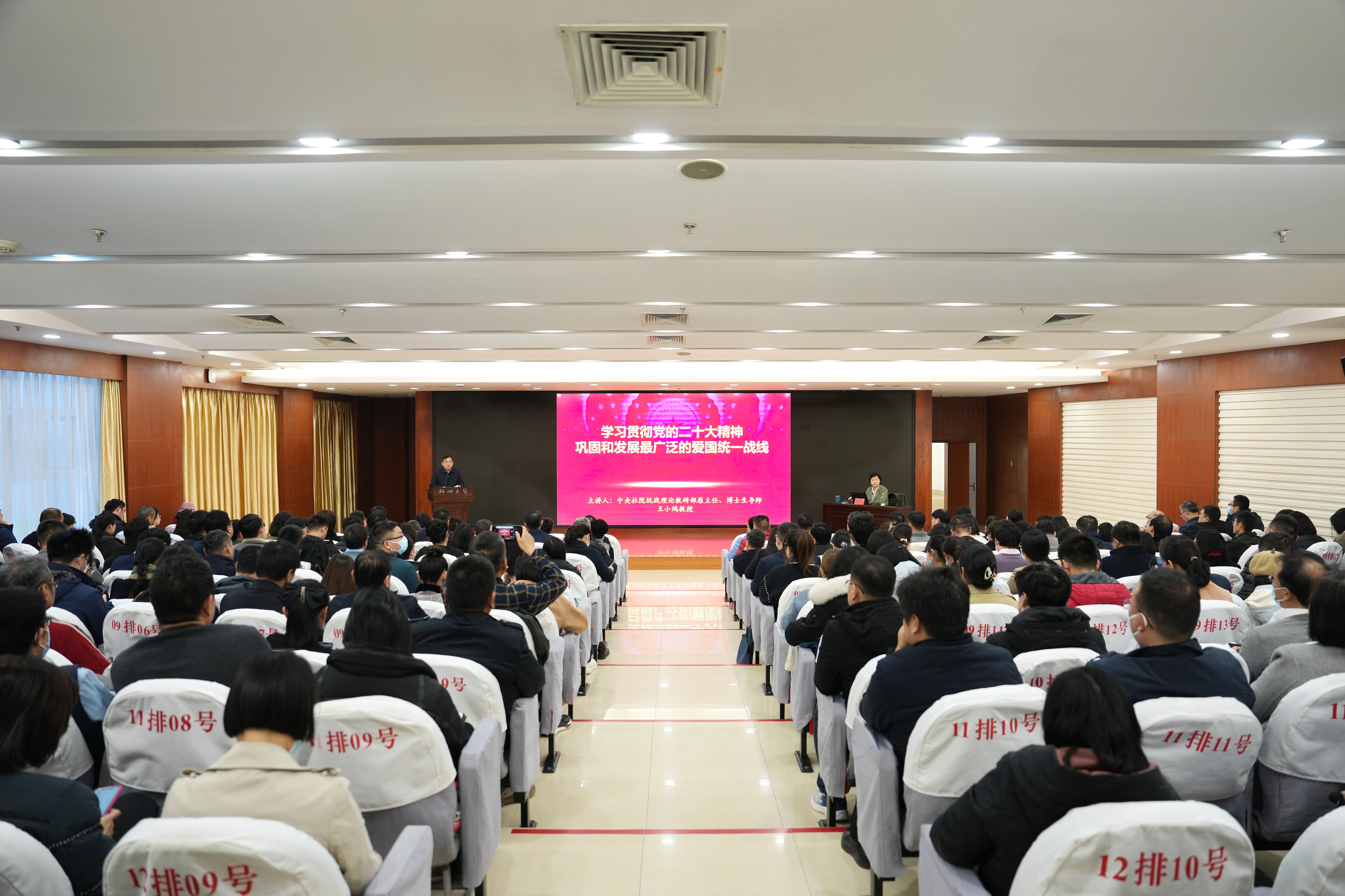 为推动bat365在线中国官网登录入口统一战线深入学习贯彻党的二十大精神,11月27日,学校邀请国内知名统战理论专家、中央社会主义学院教授、博士生导师王小鸿作《学习贯彻党的二十大精神 巩固和发展最广泛的爱国统一战线》的专题报告,此次报告也是学校统一战线第十三期的“同心讲堂”。在校的党外省级以上人大代表、政协委员,党外处级干部,各民主党派、统战团体班子成员和部分骨干成员,学校统一战线(民族宗教)工作领导小组成员单位负责人,各基层党组织统战委员,马克思主义学院师生代表,郑州西片区高校部分统战干部和统战成员代表200余人参会,报告会由校党委副书记、工会主席韩国河主持。