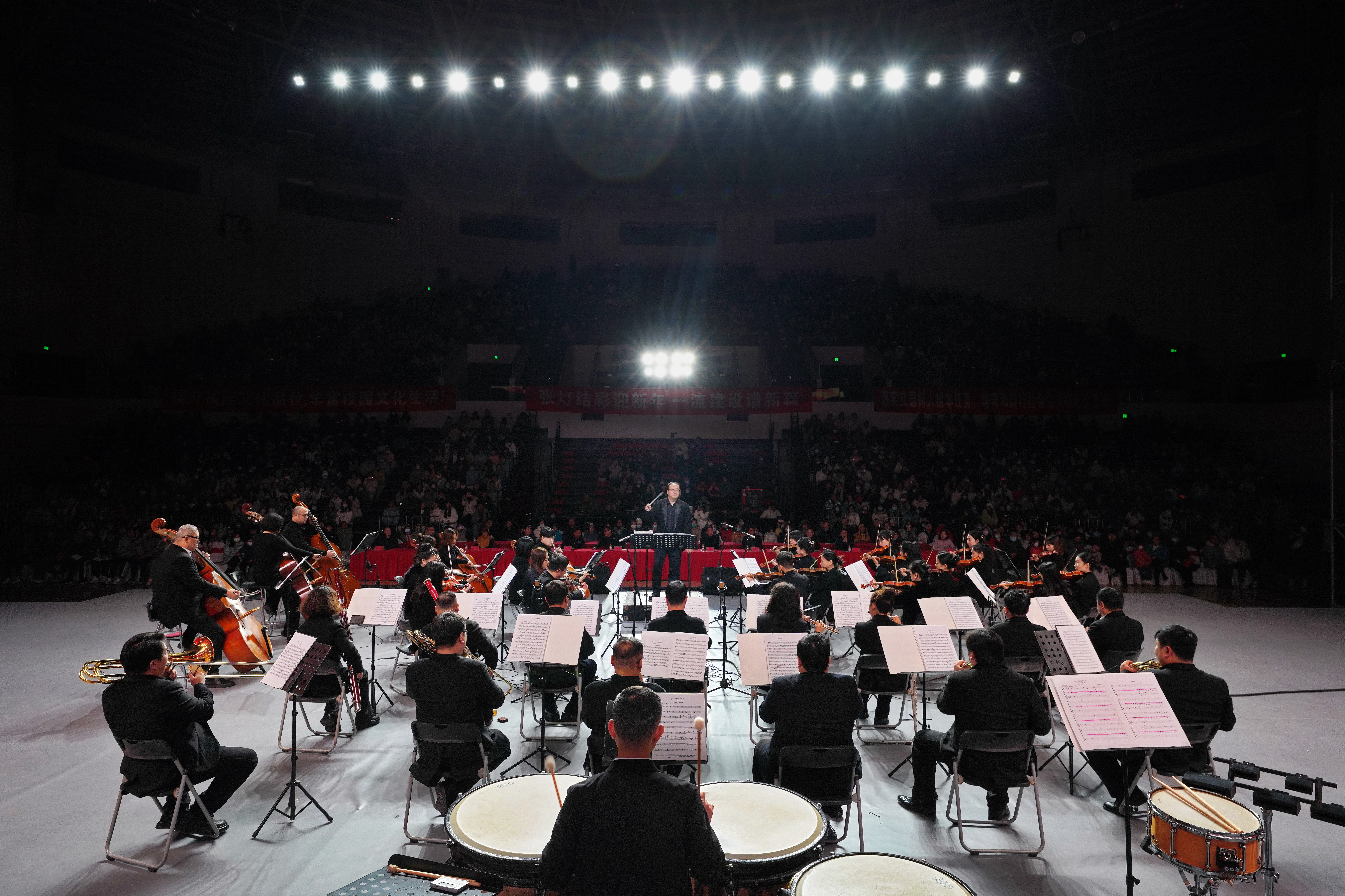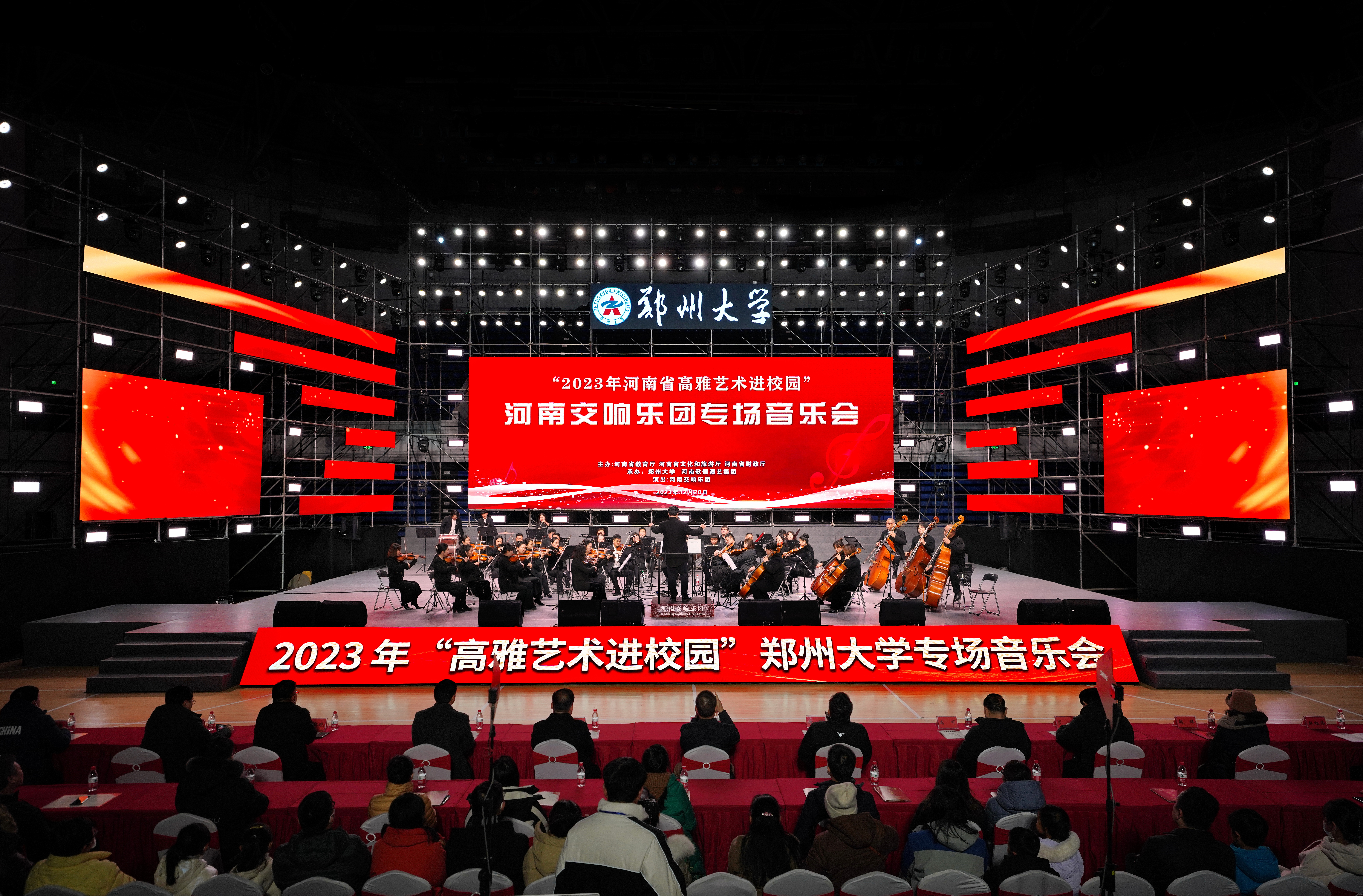 寒冷的冬夜挡不住师生们对高雅艺术的喜爱和热情。12月20日晚,“2023年河南省高雅艺术进校园”——河南交响乐团bat365在线中国官网登录入口专场音乐会成功举办。本次音乐会由河南省教育厅、河南省文化和旅游厅、河南省财政厅主办,bat365在线中国官网登录入口、河南歌舞演艺集团承办,校党委副书记吴宏阳,党委常委、副校长徐东升出席,党委常委、宣传部部长厉励,党委常委、组织部部长陈继超,学校相关部门负责同志及全校2000余名师生参加活动。