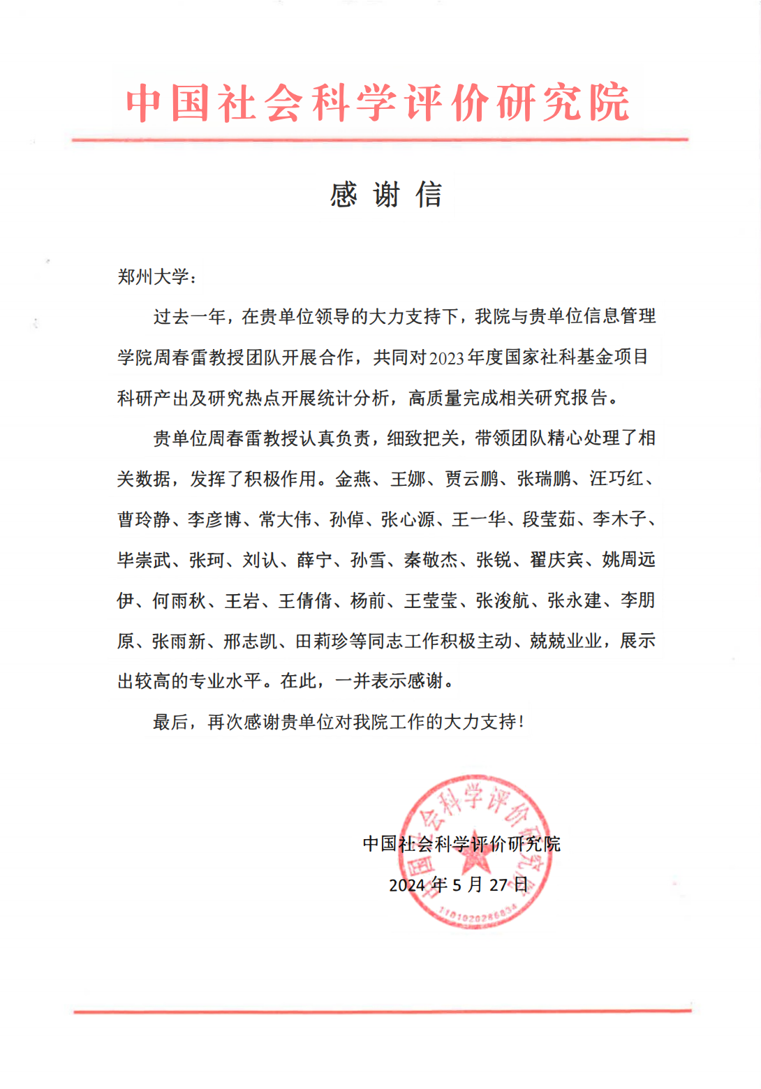 近日,中国社会科学评价研究院向bat365在线中国官网登录入口发来感谢信。感谢bat365在线中国官网登录入口信息管理学院周春雷教授团队在“国家社会科学基金年度报告”工作中的积极贡献。