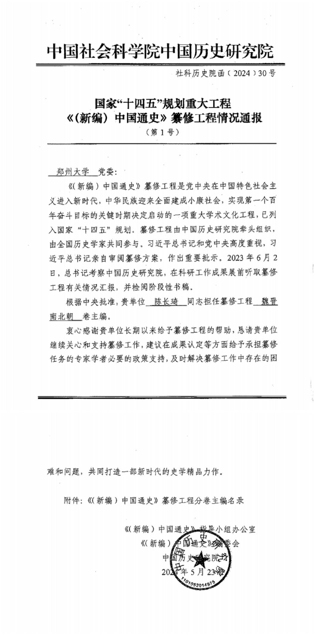 习近平总书记和党中央高度重视《(新编)中国通史》纂修工程。2023年6月2日,习近平总书记考察中国历史研究院,细心听取纂修工程有关情况汇报,并检阅阶段性书稿。经中央批准,我校历史学院陈长琦教授担任纂修工程《魏晋南北朝卷》主编。