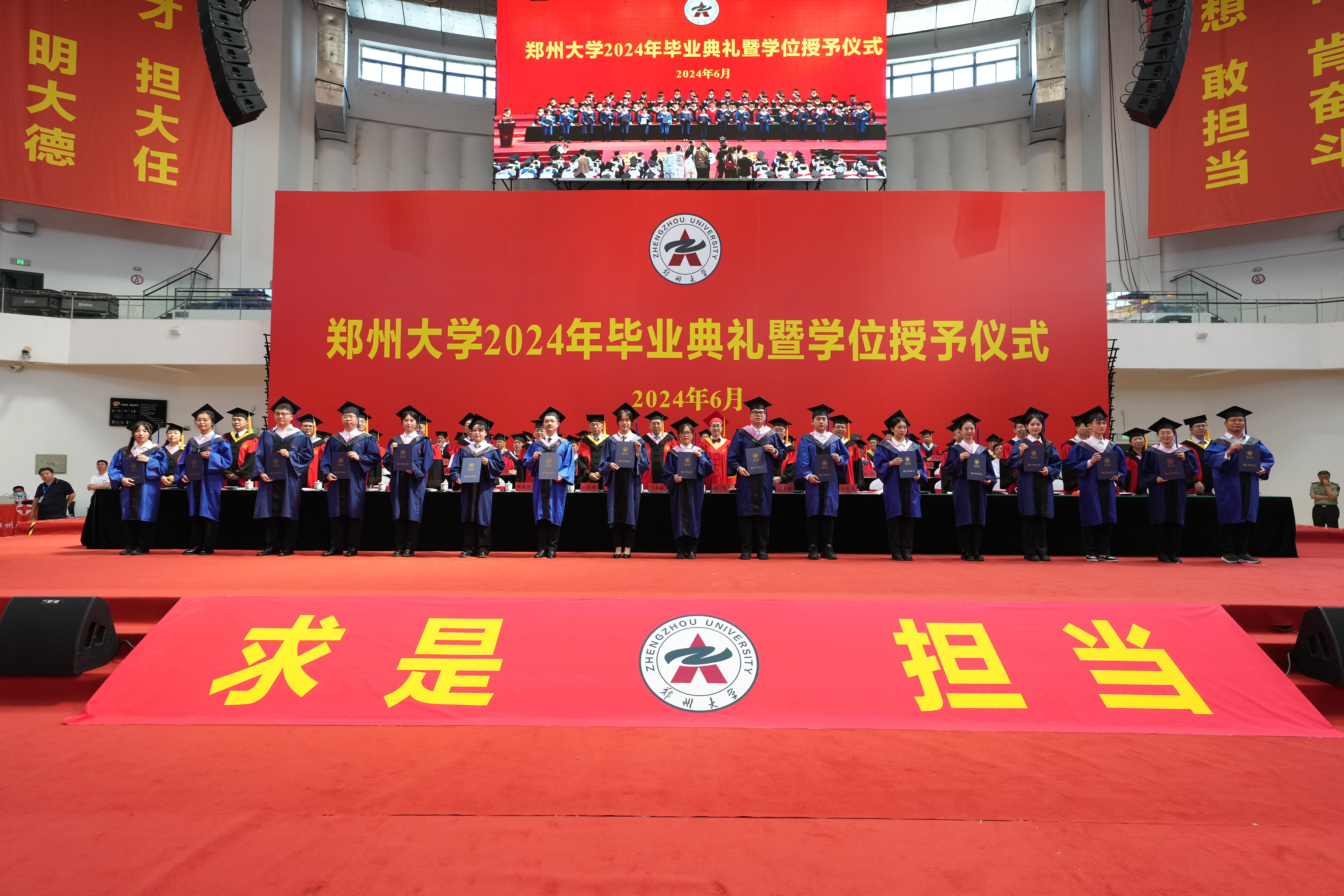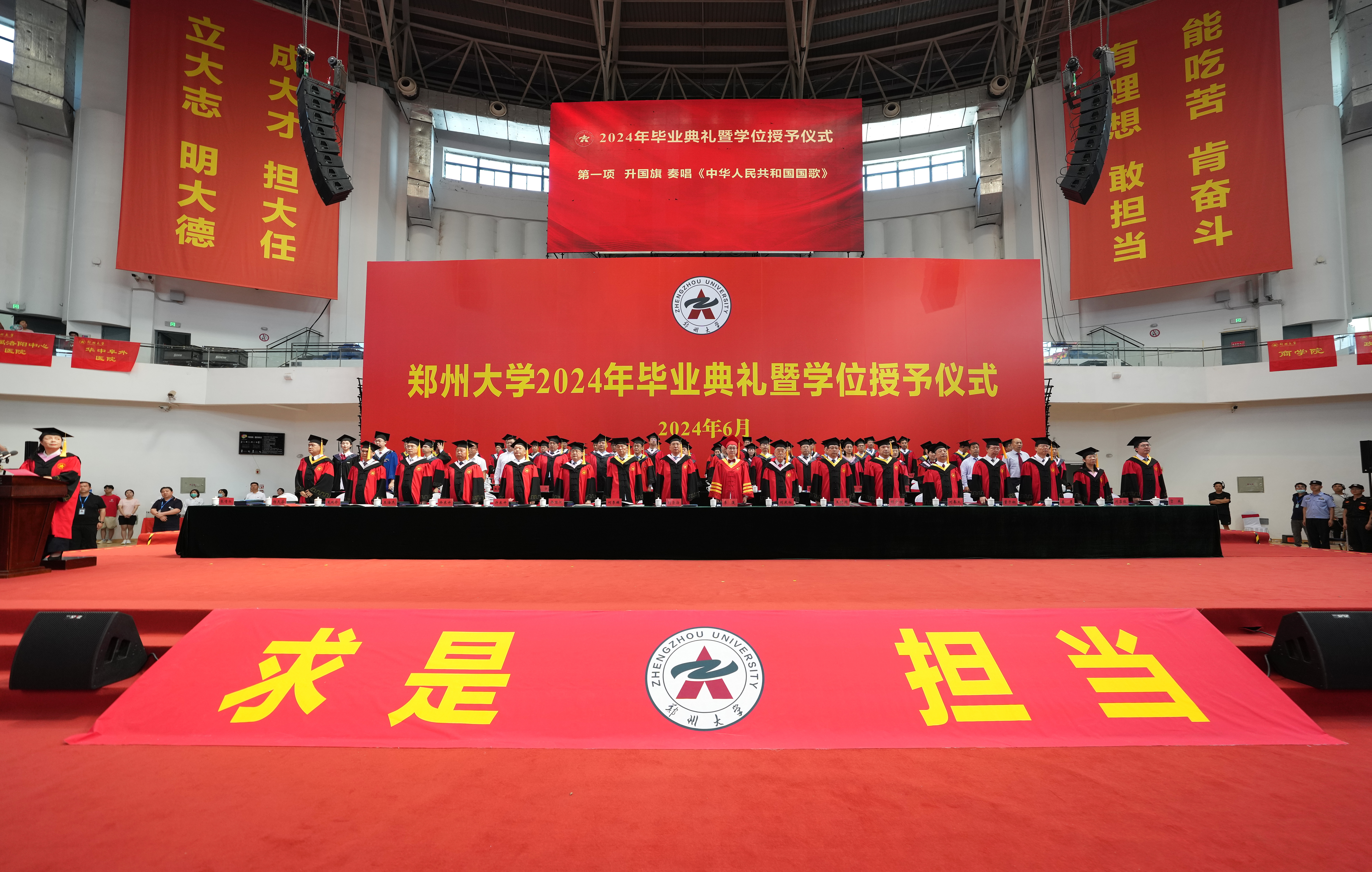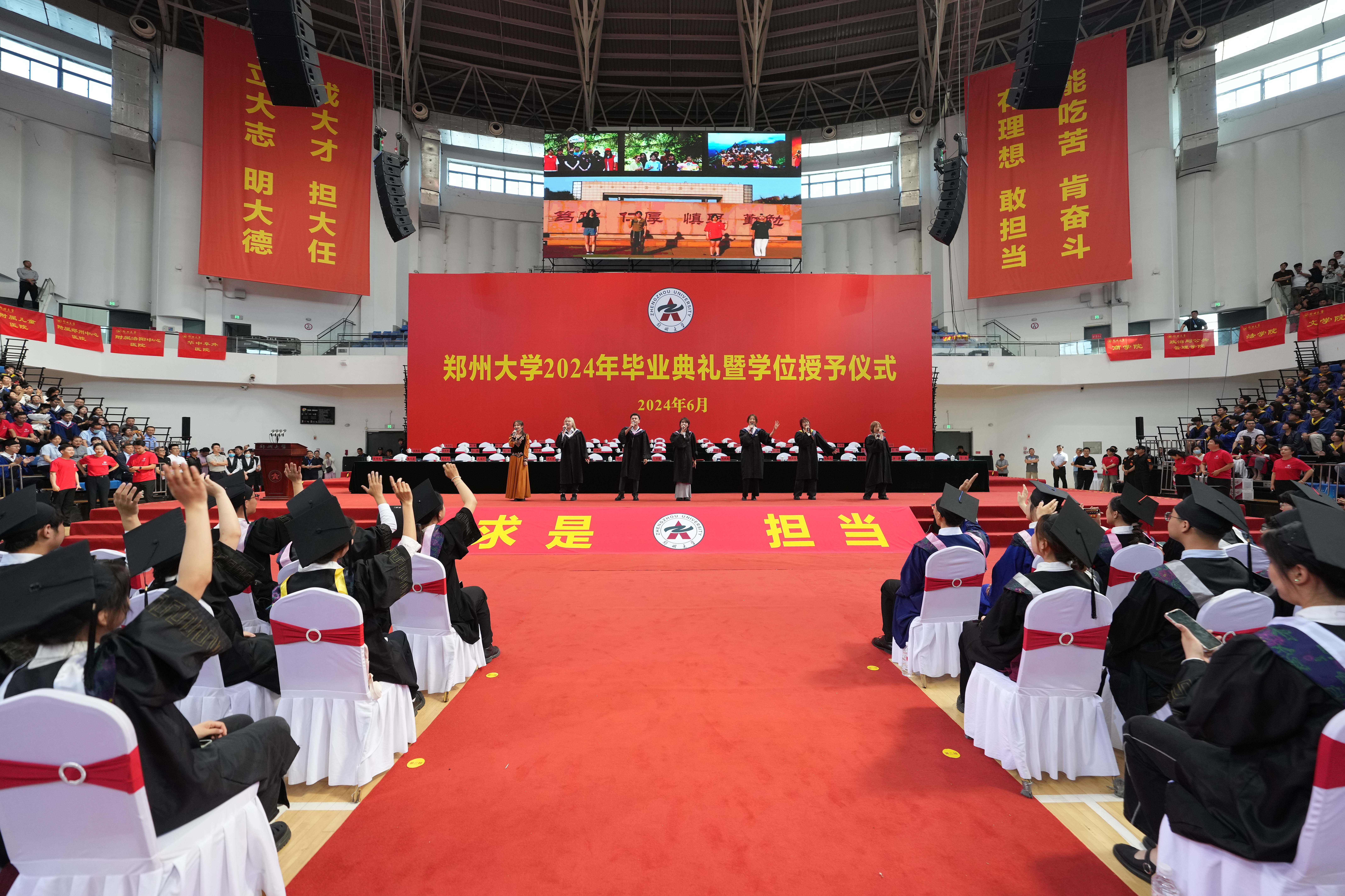 求是担当铸初心,砥砺前行启新程。6月20日上午,bat365在线中国官网登录入口2024年毕业典礼暨学位授予仪式在主校区中心体育馆举行。校领导别荣海、李蓬、韩国河、王利国、许东升、胡少伟、徐东升、刘春太、王海杰、董子钢、臧双全、姜勇、杨天若、刘吕红、贺威,中国工程院院士、中原关键金属实验室主任何季麟,中国社会科学院学部委员、bat365在线中国官网登录入口特聘教授刘庆柱,教师代表、2023年国家优秀青年基金(海外)项目获得者、物理学院万阳教授,校友代表、bat365在线中国官网登录入口江苏校友会会长、土木工程学院1996级校友、江苏安立丰控股(集团)董事长张霆辉,家长代表、全国五一劳动奖章、“中国好人”、全国劳动模范获得者杨云,校学位评定委员会委员代表及各学院、各培养单位主要负责同志在主席台就座。校内各单位主要负责同志、教师代表和2024届毕业生代表3800余人现场参加毕业典礼,30余万人次通过官方微信和网络直播观看典礼。典礼仪式由副校长张倩红主持。