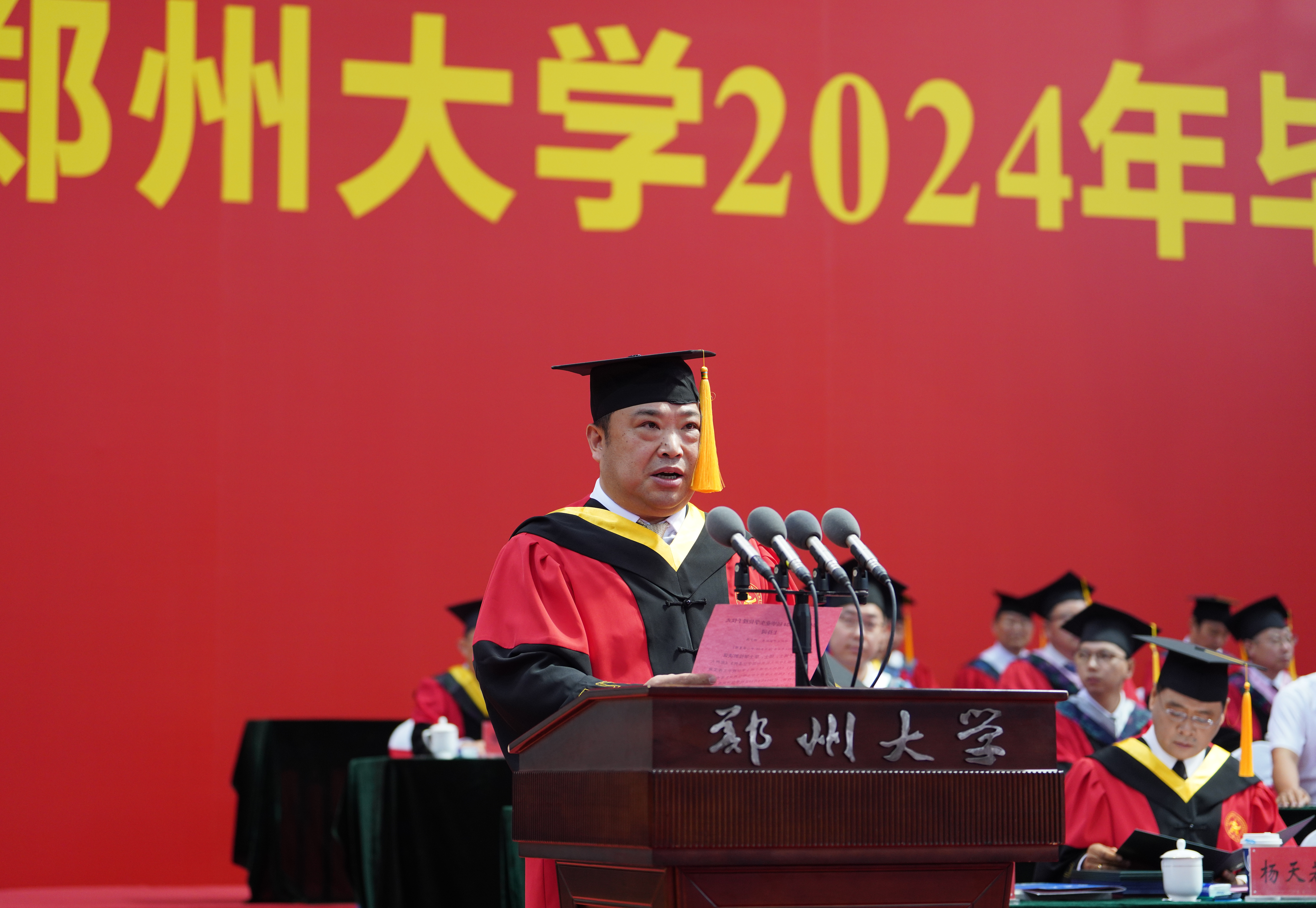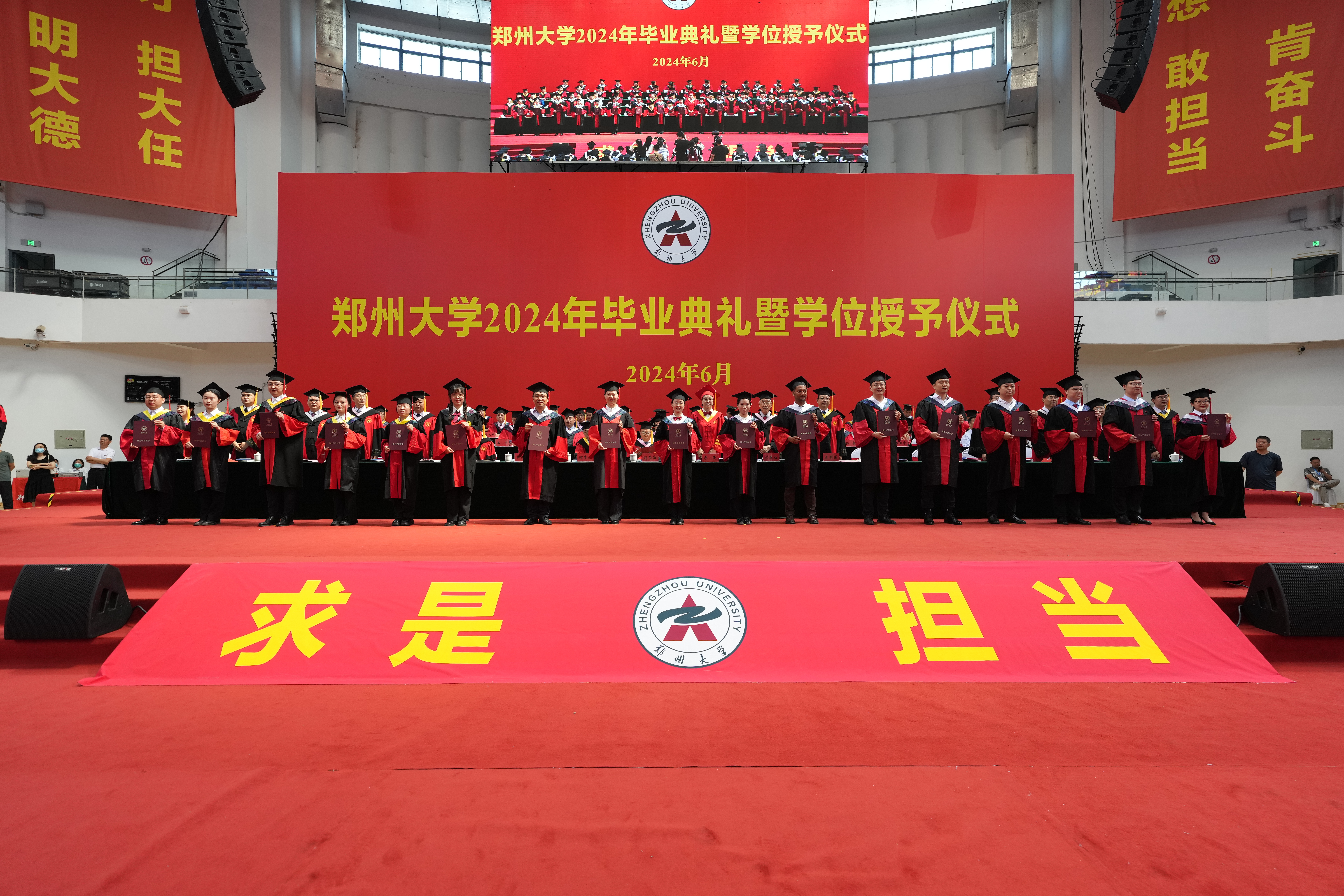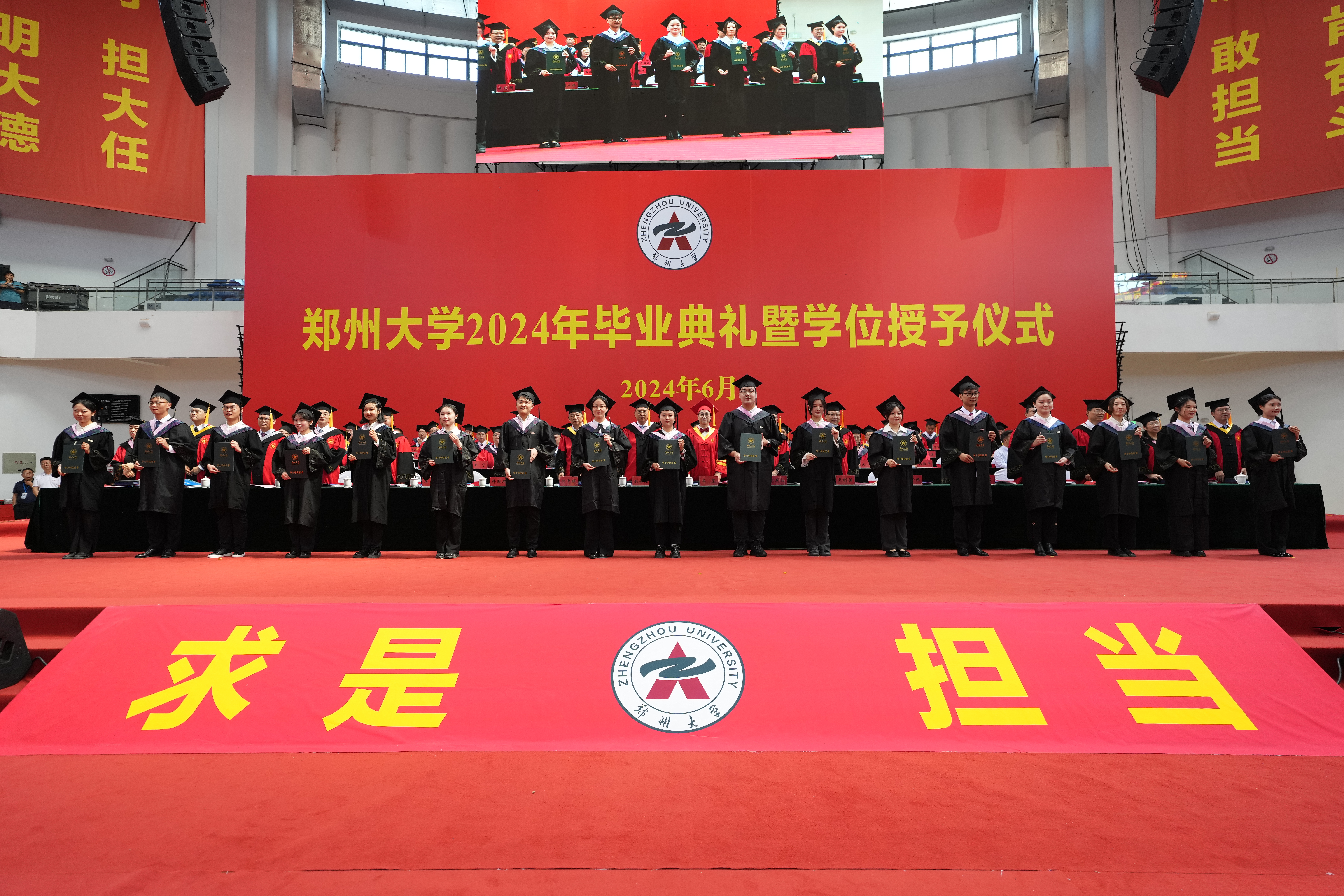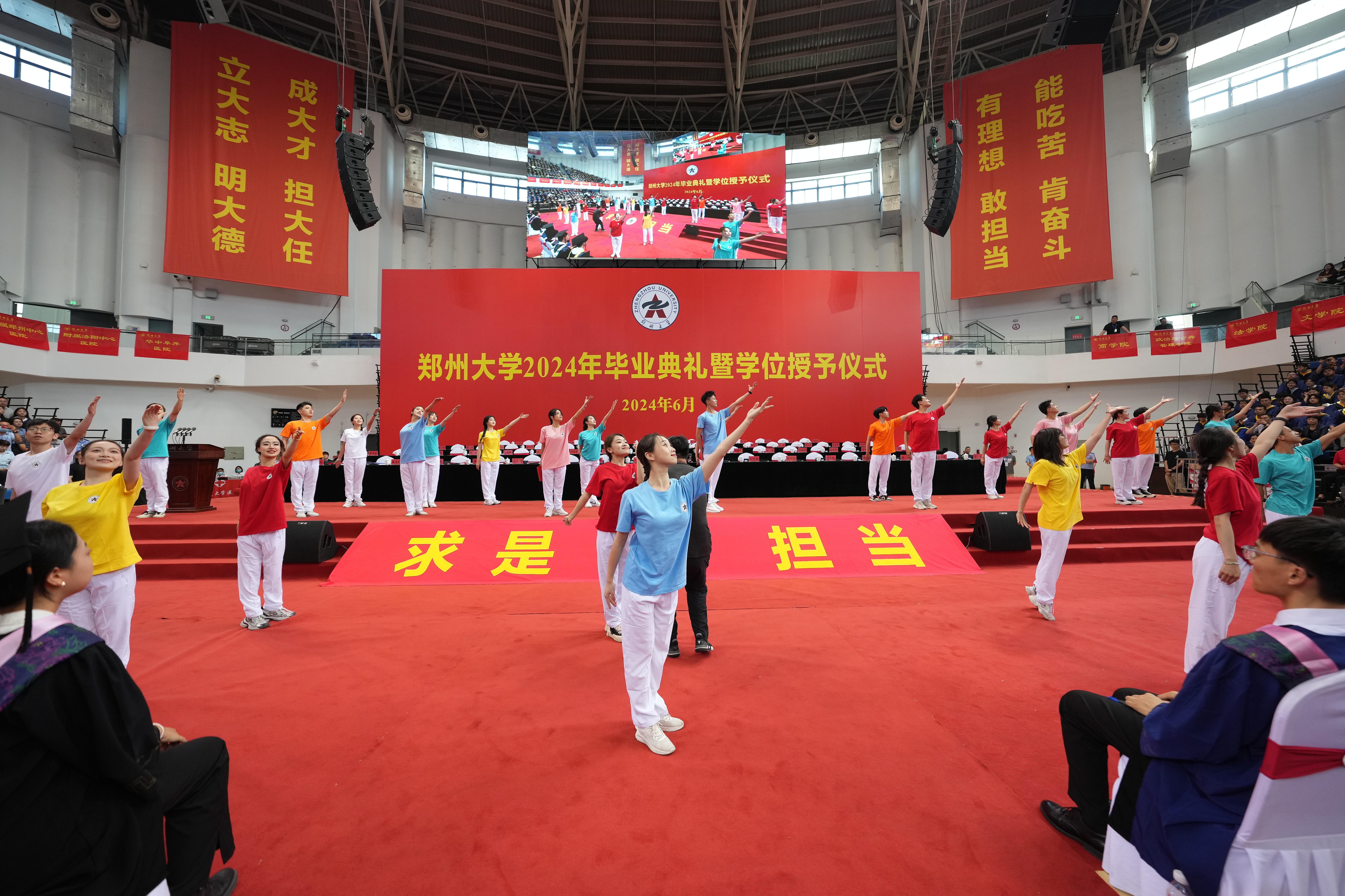 求是担当铸初心,砥砺前行启新程。6月20日上午,bat365在线中国官网登录入口2024年毕业典礼暨学位授予仪式在主校区中心体育馆举行。校领导别荣海、李蓬、韩国河、王利国、许东升、胡少伟、徐东升、刘春太、王海杰、董子钢、臧双全、姜勇、杨天若、刘吕红、贺威,中国工程院院士、中原关键金属实验室主任何季麟,中国社会科学院学部委员、bat365在线中国官网登录入口特聘教授刘庆柱,教师代表、2023年国家优秀青年基金(海外)项目获得者、物理学院万阳教授,校友代表、bat365在线中国官网登录入口江苏校友会会长、土木工程学院1996级校友、江苏安立丰控股(集团)董事长张霆辉,家长代表、全国五一劳动奖章、“中国好人”、全国劳动模范获得者杨云,校学位评定委员会委员代表及各学院、各培养单位主要负责同志在主席台就座。校内各单位主要负责同志、教师代表和2024届毕业生代表3800余人现场参加毕业典礼,30余万人次通过官方微信和网络直播观看典礼。典礼仪式由副校长张倩红主持。