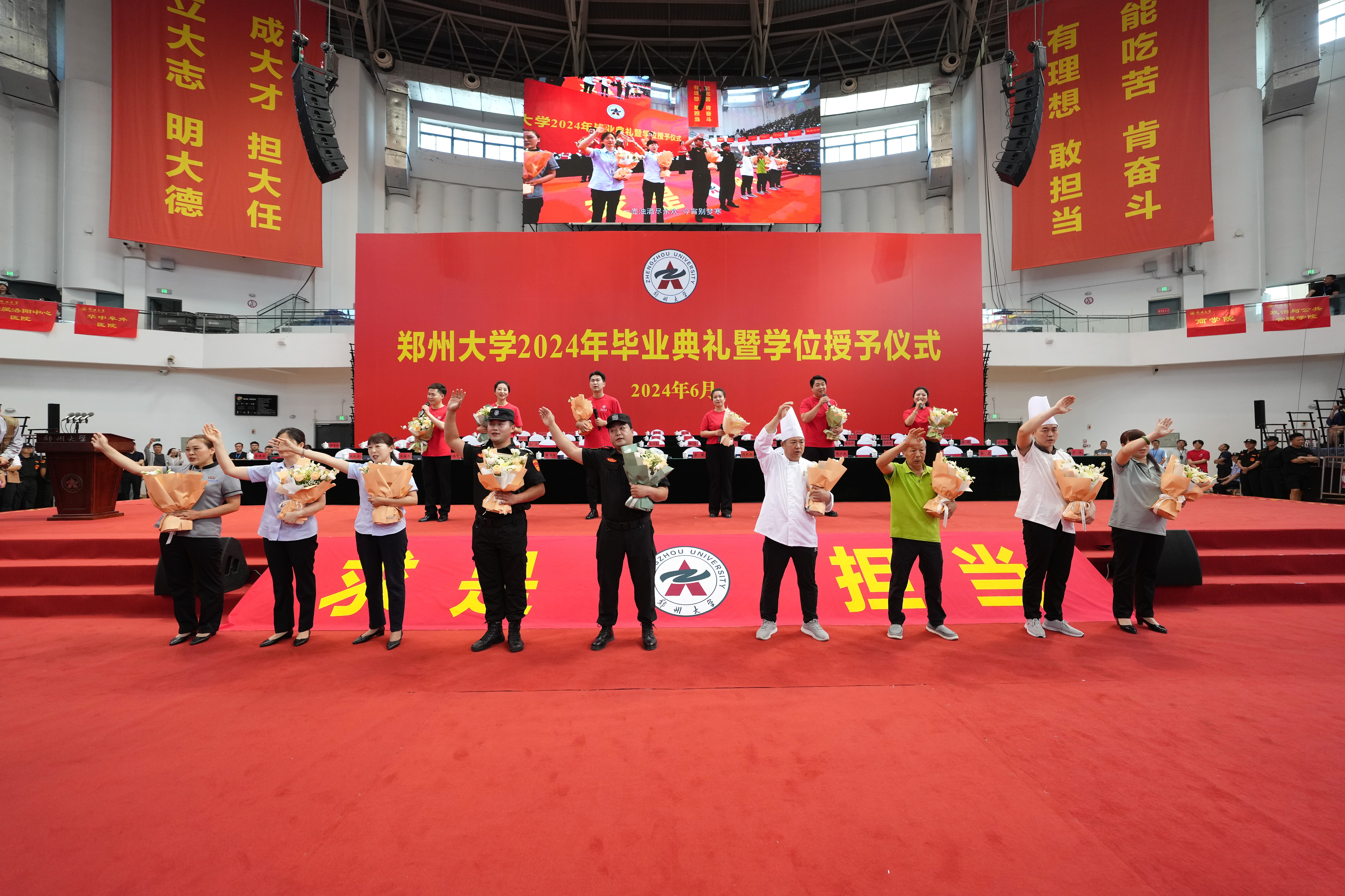 典礼开始前,舞蹈《从这里启航》用动人的韵律、青春的舞步唤醒在场毕业生那温柔流淌的郑大记忆。《篇章》《凤凰花开的路口》《再见》《光阴的故事》《无名之辈》……一首首优美的歌声,唱出了对母校、师长和同窗的依依惜别,对启航新征程的美好憧憬。《朝阳沟选段》用传统豫剧与现代说唱的碰撞,唱出了生机勃勃的中原文化,全场观众高呼“真中!”辅导员和宿管、保洁员等后勤保障人员为毕业生带来一首深情的《送别》,打动了每一位观众,现场响起阵阵掌声。