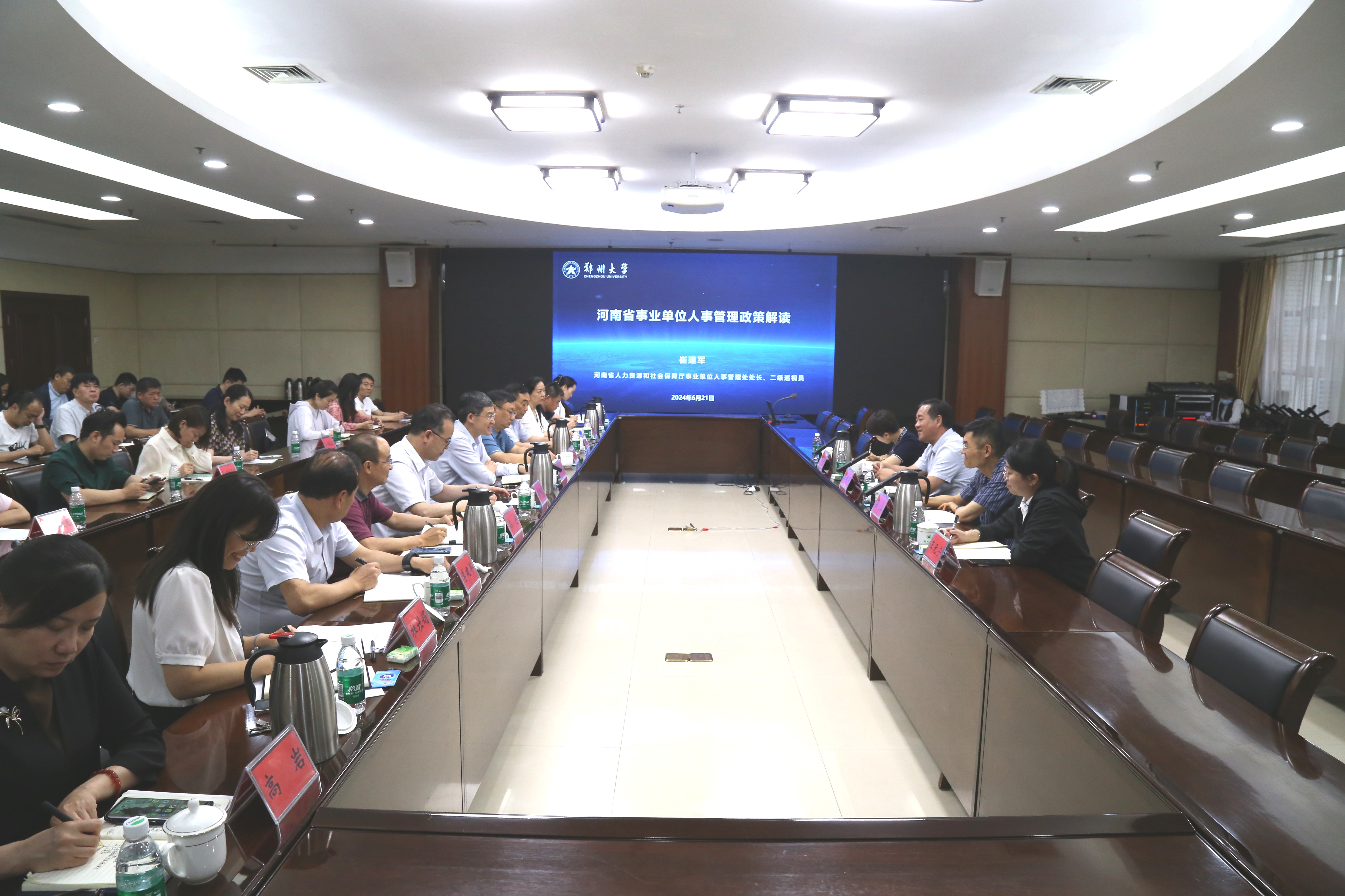 为进一步提升学校人事管理工作水平和服务质量,人事部持续开展综合素质能力提升系列培训,近日,省人社厅二级巡视员、事业单位人事管理处处长崔建军一行受邀来校作人事政策解读宣讲。副校长王海杰出席并主持会议,河南医学院,医学科学院、天健先进生物实验室(bat365在线中国官网登录入口),学校第一、二、三、五附属医院人事部门等部门相关负责同志,以及人事部(党委教师工作部、党委人才办公室)全体人员参加。