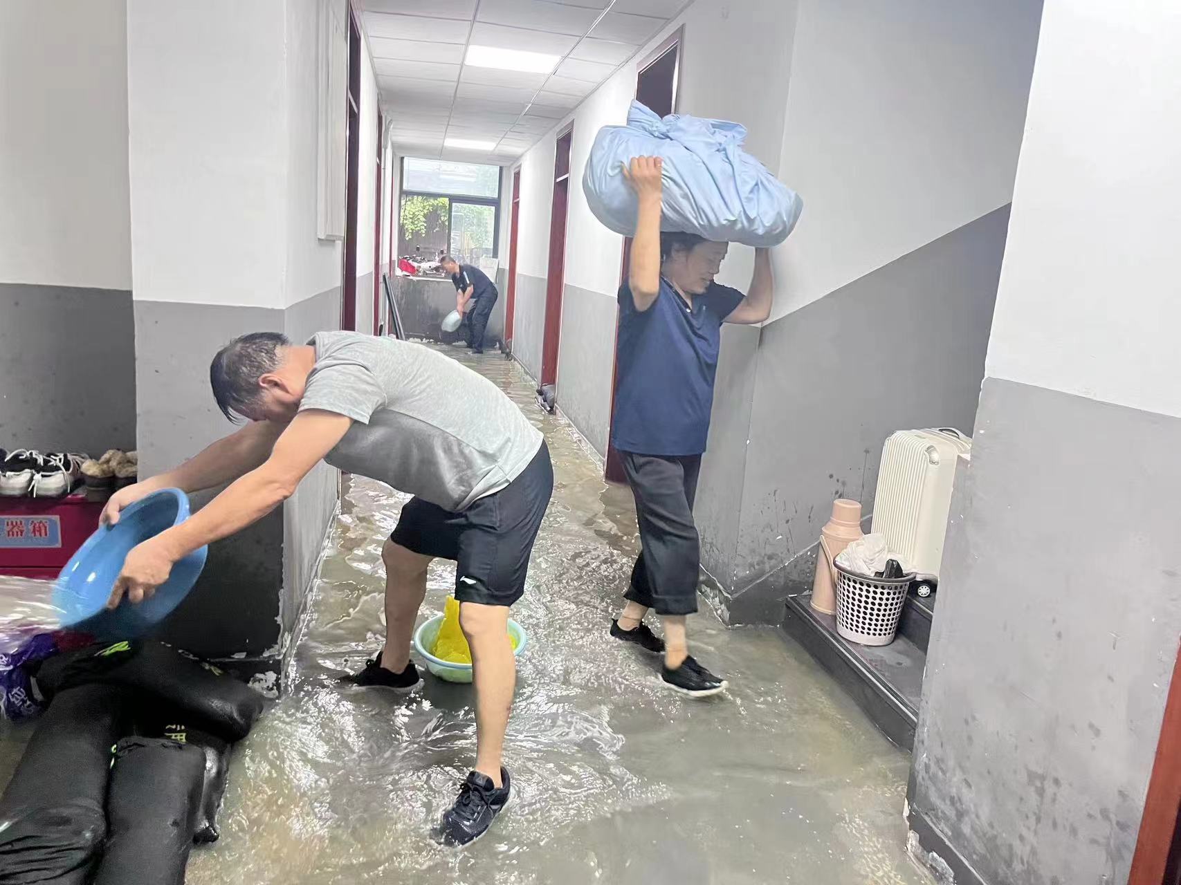 工作人员帮助学生转移宿舍、清理楼内积水
