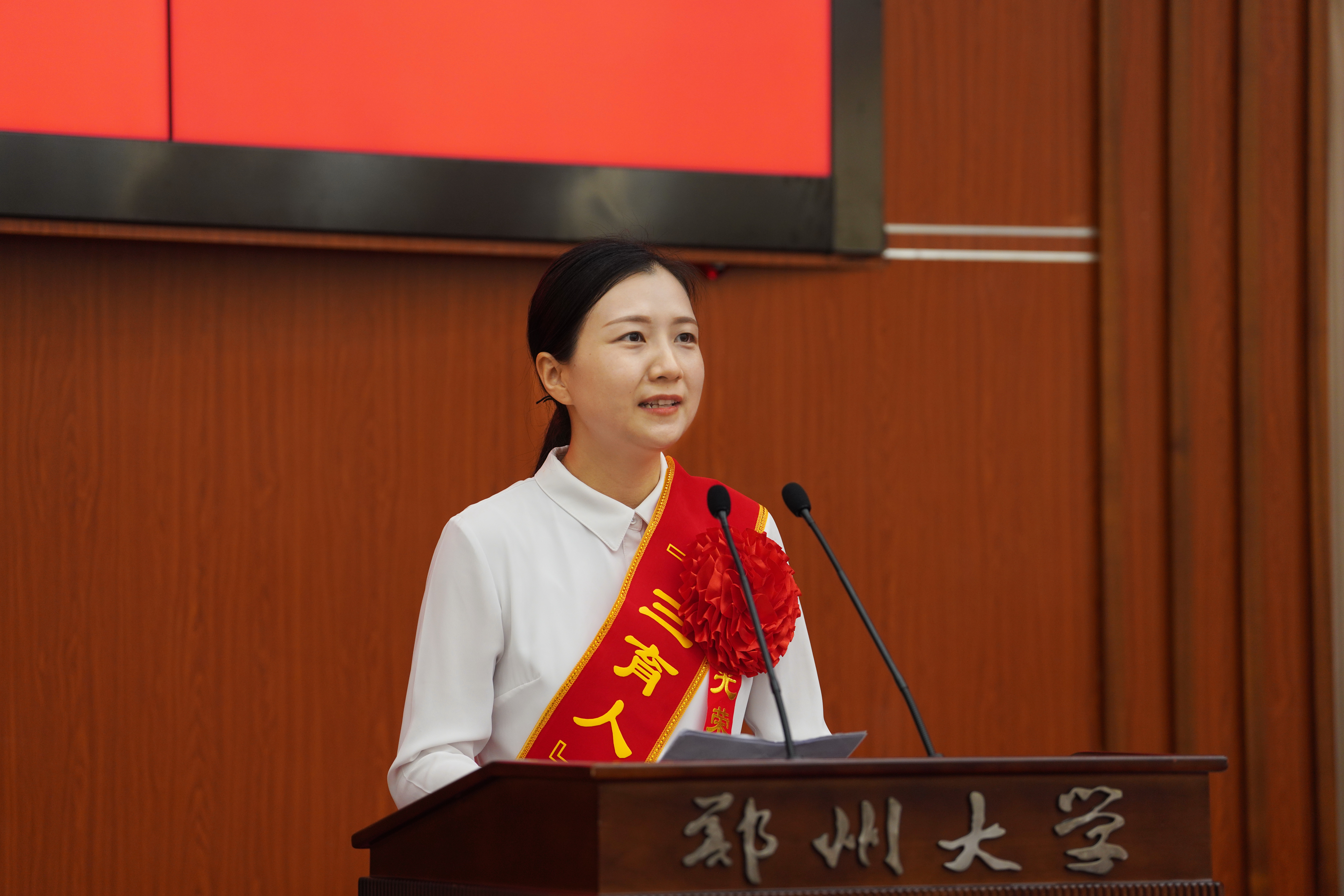 副校长张倩红宣读《关于表彰bat365在线中国官网登录入口2023-2024学年校级“三育人”先进个人的决定》,校党委常委、副校长胡少伟宣读《关于表彰“教龄满30年教师”的决定》,与会领导为“三育人”先进个人代表颁发荣誉证书。校长李蓬院士为“教龄满30年教师”代表颁发奖杯。材料科学与工程学院田佳佳、基础医学院李翔、后勤保障中心杜道运3位教师分别作典型发言。