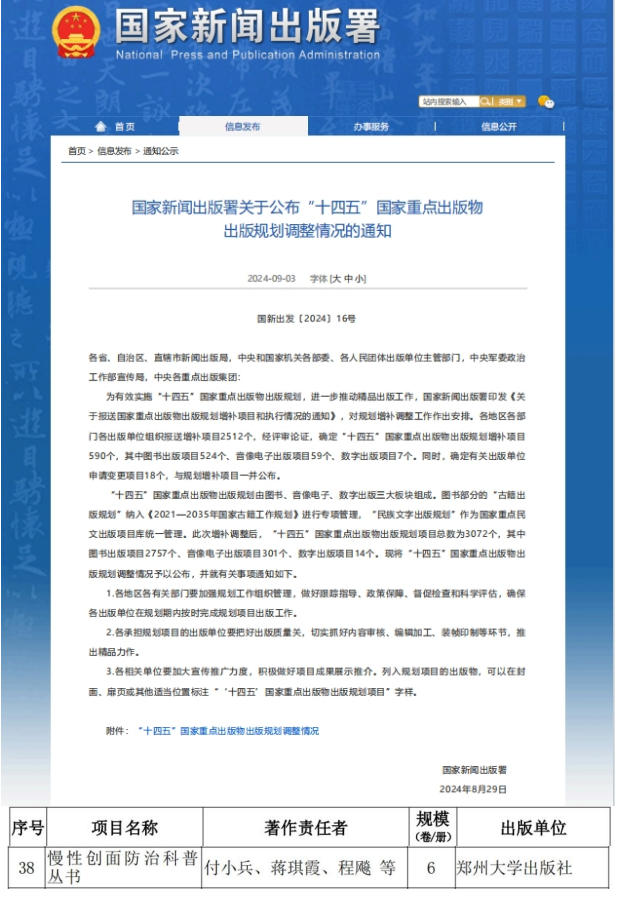 近日,《国家新闻出版署关于公布“十四五”国家重点出版物出版规划调整情况的通知》(国新出发〔2024〕16号)发布,bat365在线中国官网登录入口出版社组织策划的“慢性创面防治科普丛书”入选“十四五”国家重点出版物出版规划增补项目。